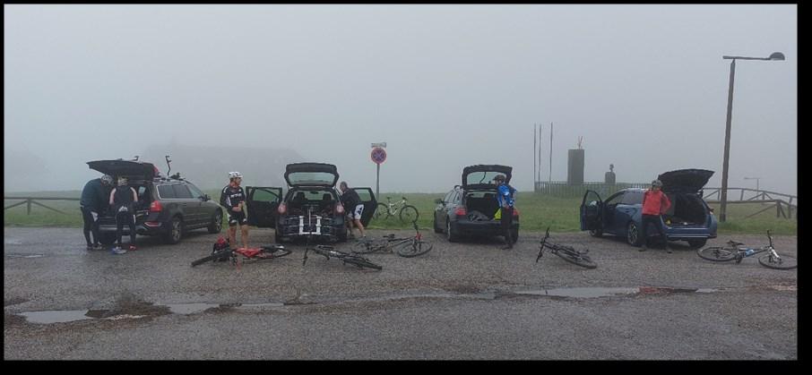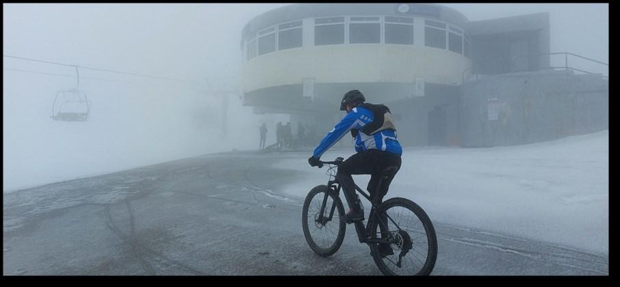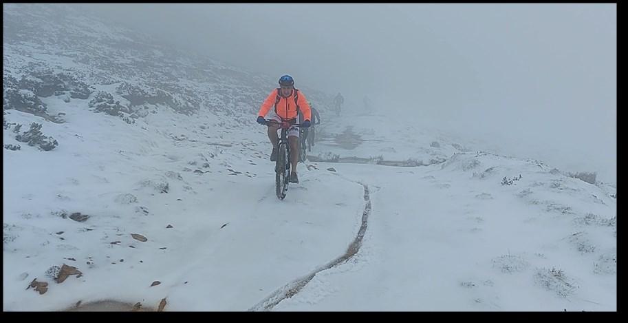 Enseguida nos “devora” la realidad de lo que iba a ser la constante durante la primera parte de la ruta. Nieve, niebla y ventisca…las ventajas del asfalto se desvanecen y ahora los derrapes ya se deben a la capa de nieve que se acumula en la carretera. En pelotón bastante compacto vamos ascendiendo, con dificultad, sobre el asfalto de color blanco, con alguna que otra caída de poca importancia…
