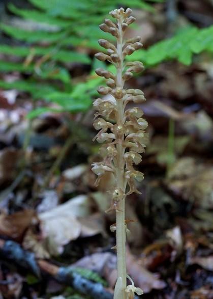 Neottia nidus-avis la encontramos en los hayedos, no es muy frecuente tiene una característica única y es que no tiene clorofila creciendo en simbiosis con hongos, sus raíces tienen forma de nido, de ahí su nombre las fotos nos muestran un ejemplar y detalle de la flor