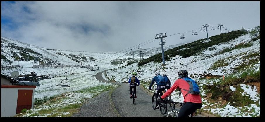Mes de mayo, perfecto para la bici, habíamos dicho…un sol engañoso nos hace sonreír, aunque por poco tiempo mientras vamos viendo restos de la nevada de esa noche…