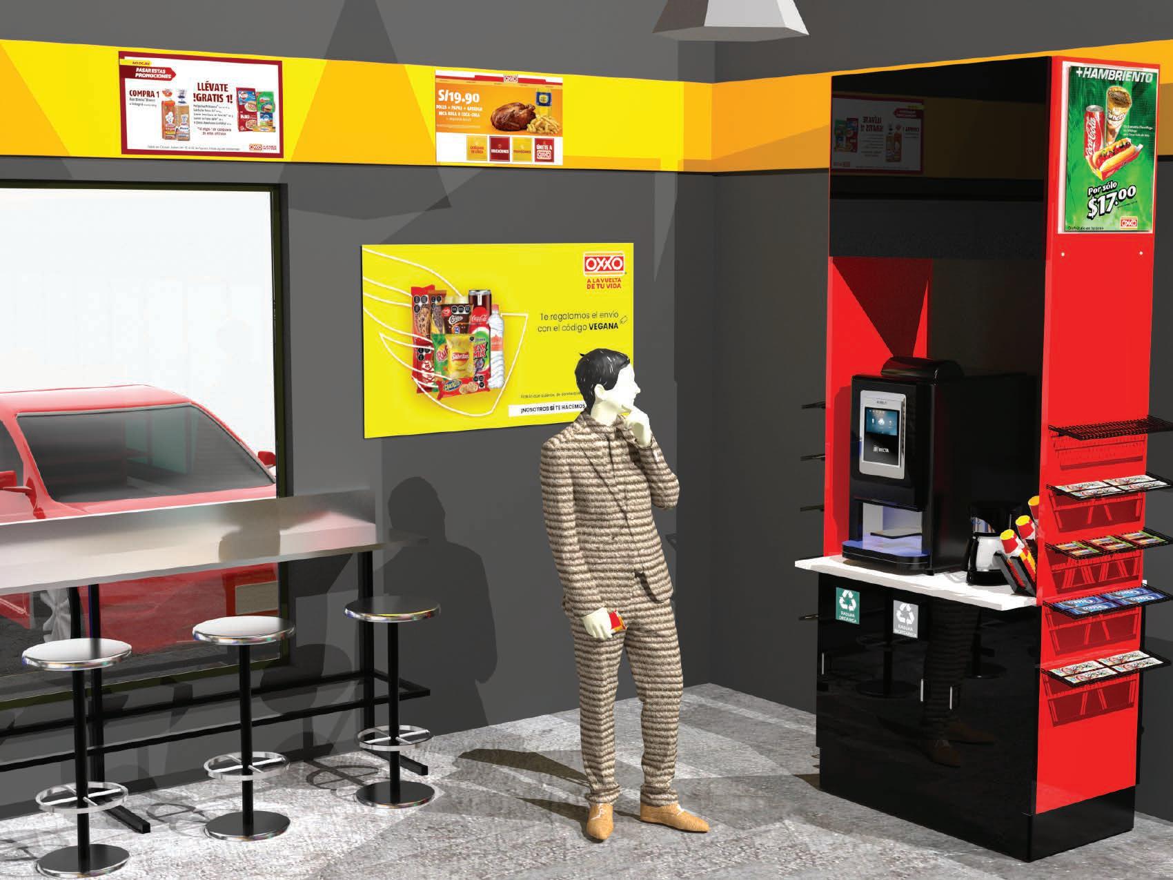 Objetivo de empresa Oxxo: rediseñar sus locales creando un formato de tienda que pueda operar bajo un modelo de negocio más compacto con una propuesta de valor más adecuado al entorno. El proyecto tuvo un desarrollo de 6 meses con el objetivo de responder a Oxxo con una solución de diseño en áreas asignadas para la nueva tienda integrando un proceso de innovación centralizado en diferentes áreas de investigación de ventas, ergonomía y ujo de tienda, planos de manufactura del mobiliario, entre otros procesos más guiados por un mapa de planeación.