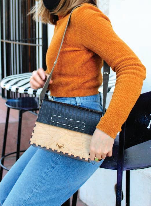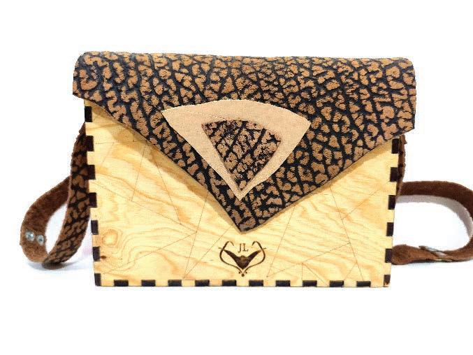 This experimental creation is made of wood for the body structure of the bag. Plywood is used which makes it light. The material is cut on a laser machine and the vector cut generates this checkered pattern on the box design adding thin lines that give it a modern touch. Natural leather strap and lid with texture, di erent nishes and inked colors all hand-stitched to add an original and unique personality.