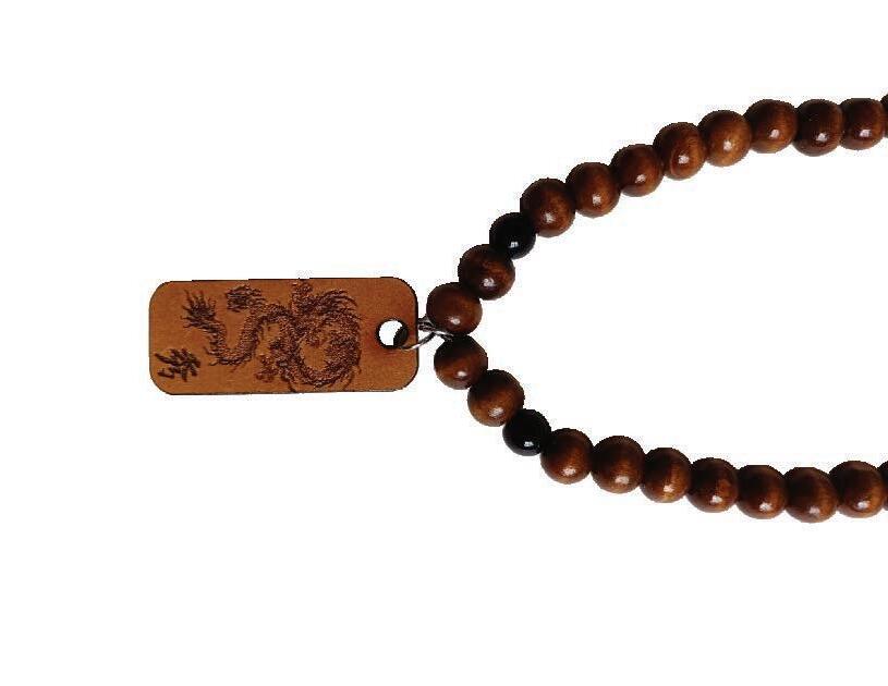 Jewelry design with laser-engraved wooden charms personalized with di erent Chinese letters, each with a di erent meaning, and a di erent dragon. Collaboration with “Airbone.co”