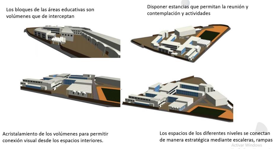 La ubicación de los bloques forman patios en forma de u, esto brinda iluminación natural a las aulas y pasillos
