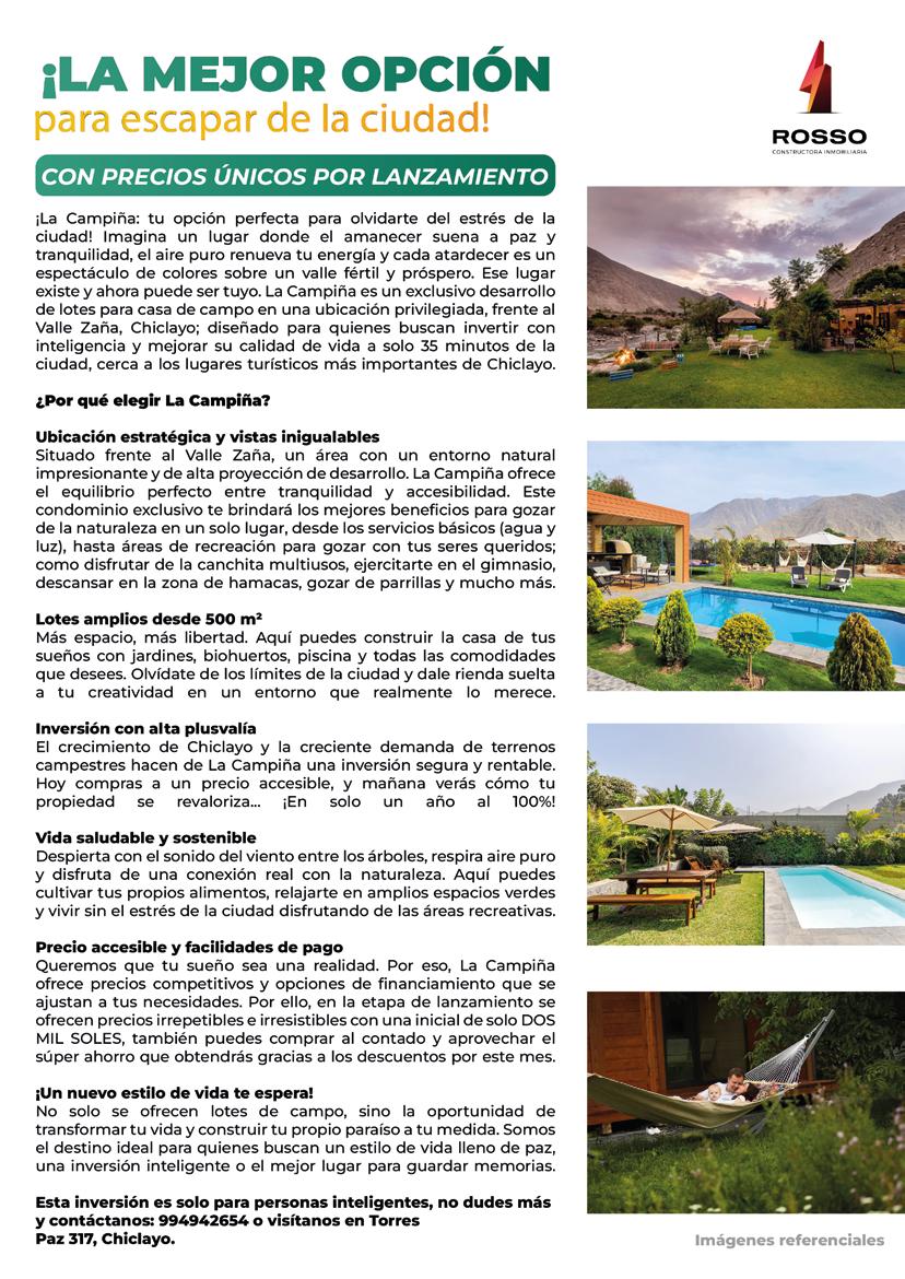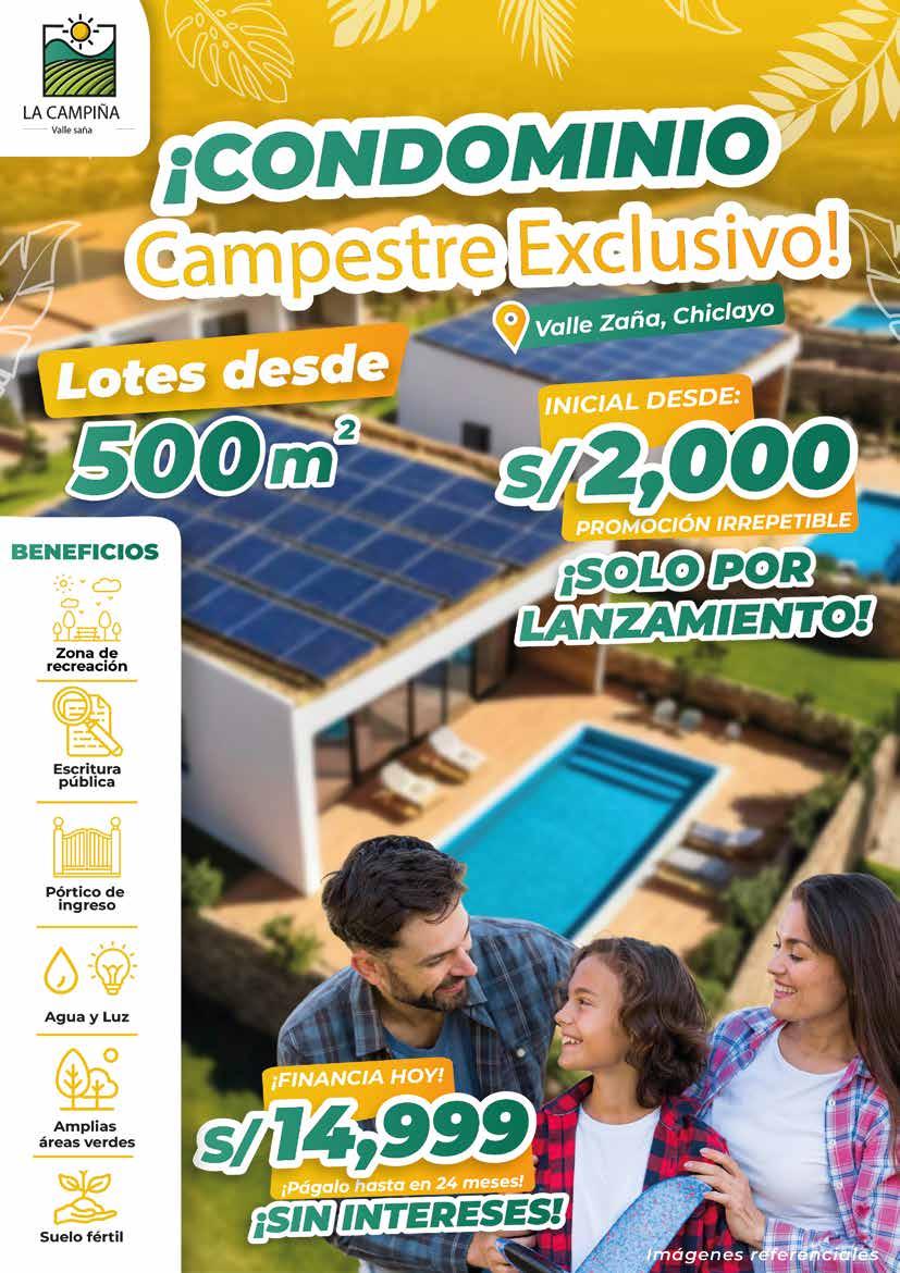 * Urbanizaciones: Ubicadas en JLO, Ferreñafe, Reque, etc. Estas urbanizaciones ofrecen lotes con servicios básicos completos, áreas verdes, ciclovías y zonas recreativas. Ha experimentado una revalorización de hasta un 64% en proyectos previos, lo que la convierte en una opción atractiva para inversionistas.