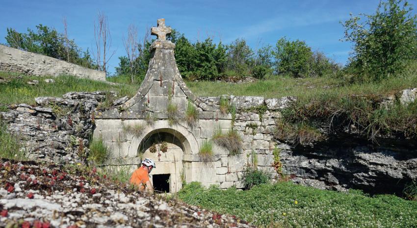 suelo. Casi al mismo nivel se construyó el lavadero. La fuente ofrece graciosamente su agua, pero es de las que exigen humillación a quien la toma; a quienes tuvieron que hacer la colada en el lavadero —seguro que solo mujeres— les exigía además arrodillarse. He vuelto a recorrer el pueblo buscando una tercera fuente frente a la que he pasado un par de veces antes de verla. En la iglesia me he detenido para admirar una portada gótica que desde el exterior da entrada a otro espacio abierto. Es una puerta que no cierra nada, pero a través de ecaleras te introduce en el apacible y herboso lugar que, rodeado por un muro, hay frente a la iglesia. La portada no es de Castrobarto; procede de Muga, un pueblo desaparecido. El lugar al que se accede por ella es el antiguo cementerio. “Descanse en paz” , repetiría todo el vecindario cuando dieron tierra a todas las personas cuyos restos están o estuvieron allí enterrados. Puedo asegurar que hoy no se respiraba otra cosa En Castrobarto (Junta de Traslaloma) me he entretenido más tiempo del que pensaba, así que de camino a Salinas de Rosío no he parado en Villalacre. He traicionado a su fuente y de ella solo sé que