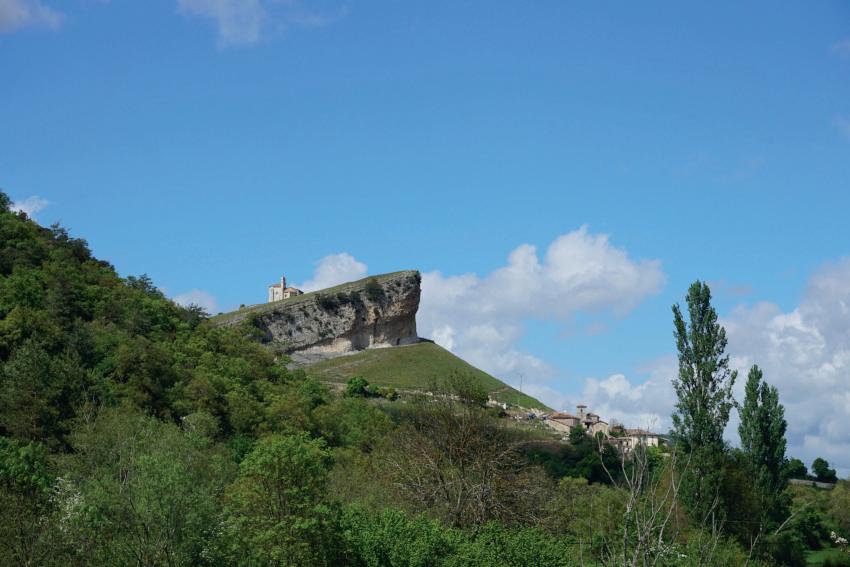 ‒Me duró el olor a jabalí una temporada larga. Él se ha marchado en bici y yo he subido hasta la lobera por la pista. De vuelta a la carretera he descendido para llegar a Río de Losa por Castriciones y Quintanilla la Ojada. Antes de pasar por San Pantaleón de Losa no he podido resistir la tentación de pararme a fotografiar el impresionante espolón rocoso sobre el pueblo y la ermita de San Pantaleón que lo corona.