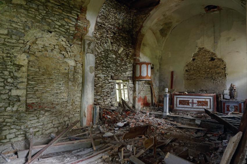 aquí sí hay unas cuantas casas ocupadas. La iglesia está en franca ruina; el tejado ya no protege el interior, la humedad lo ha impregnado todo y el suelo está lleno de escombros. Sobre el altar había un trozo de calavera y varios huesos; a un lado del altar una imagen de la Virgen a la que le falta el brazo derecho (y sin embargo sonríe), probablemente llevaba un rosario en la mano; junto a la puerta hay un Sagrado Corazón derrotado y triste, como arrojado en una huida precipitada y abandonado contra el muro… El lavadero tiene la cubierta derruida y el estanque seco. La fuente desde la que llegaba el agua al lavadero, algo alejada, tiene un abrevadero a cada lado de su pileta, el de la izquierda seco; del caño que sale de su pilastra no cae agua, solo algo de humedad por el orificio en el que debió haber otro. Regreso hasta Quincoces para ir por pistas a Lastras de la Torre, Villabasil, Castresana y Villaventín. En los cuatro pueblos me acerco a sus fuentes.