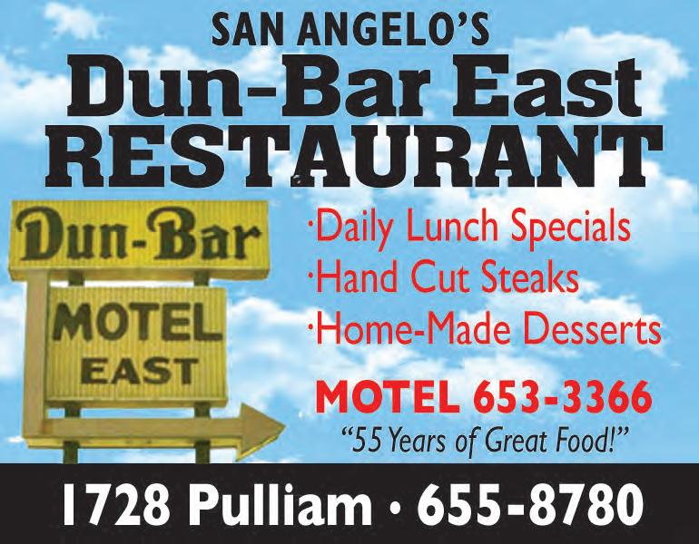 Homestyle Burgers Steak Fingers Fries Wings Onion Rings Much More! 1205 N. Chadbourne San Angelo, Texas 325-374-6874 WWW.STEVESCARPETCLEANINGTX.COM 4388 Sherwood Way | 325-617-4472 | alejandrostx.com