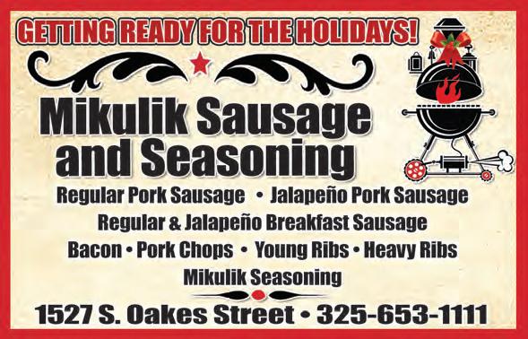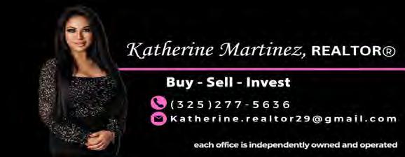 San Angelo 2024 | 21 Driven by Relationships, Dedicated to Results! TOP 10 THINGS TO DO WHEN SELLING OR BUYING A HOME: #1. Call me. (I’ll handle the other 9) Aurora U. Prieto, REALTOR® 325-212-9277 Continuing The Tradition of Providing Excellent Service Thank You for Trusting Us With Your Special Events For The Past 19 Years 325-212-9277 PUBLIK HYPE 19 W Beauregard Ave Suite#19B San Angelo, TX 76903 Monday – Thursday 12-6PM Friday – Saturday 12-8PM Store Hours ESTATE SALES CUSTOM EMBROIDERY COLLECTIBLES • ANTIQUES AND MORE 42 E. CONCHO AVE. 325-655-3962 Cow Patties - Thrift Shop 31A W. Twohig San Angelo, TX 76903 325-315-7148 Hours: Thursday & Friday (8am - 5 pm) Saturday (9am - 3pm) 125 E. Concho, Downtown 325 - 617- 2527 WEATHERSBEE ELECTRIC CO., INC. 1934 YouServingSince STARTERS • ALTERNATORS • D.C. MOTORS • MAGNETOS • WINCH MOTORS NEW UNITS AVAILABLE KRIS SALAZAR OWNER VETERAN OWNED & OPERATED 7 EAST HIGHLAND 325-655-7555 WEATHERSBEEELECTRIC@GMAIL.COM