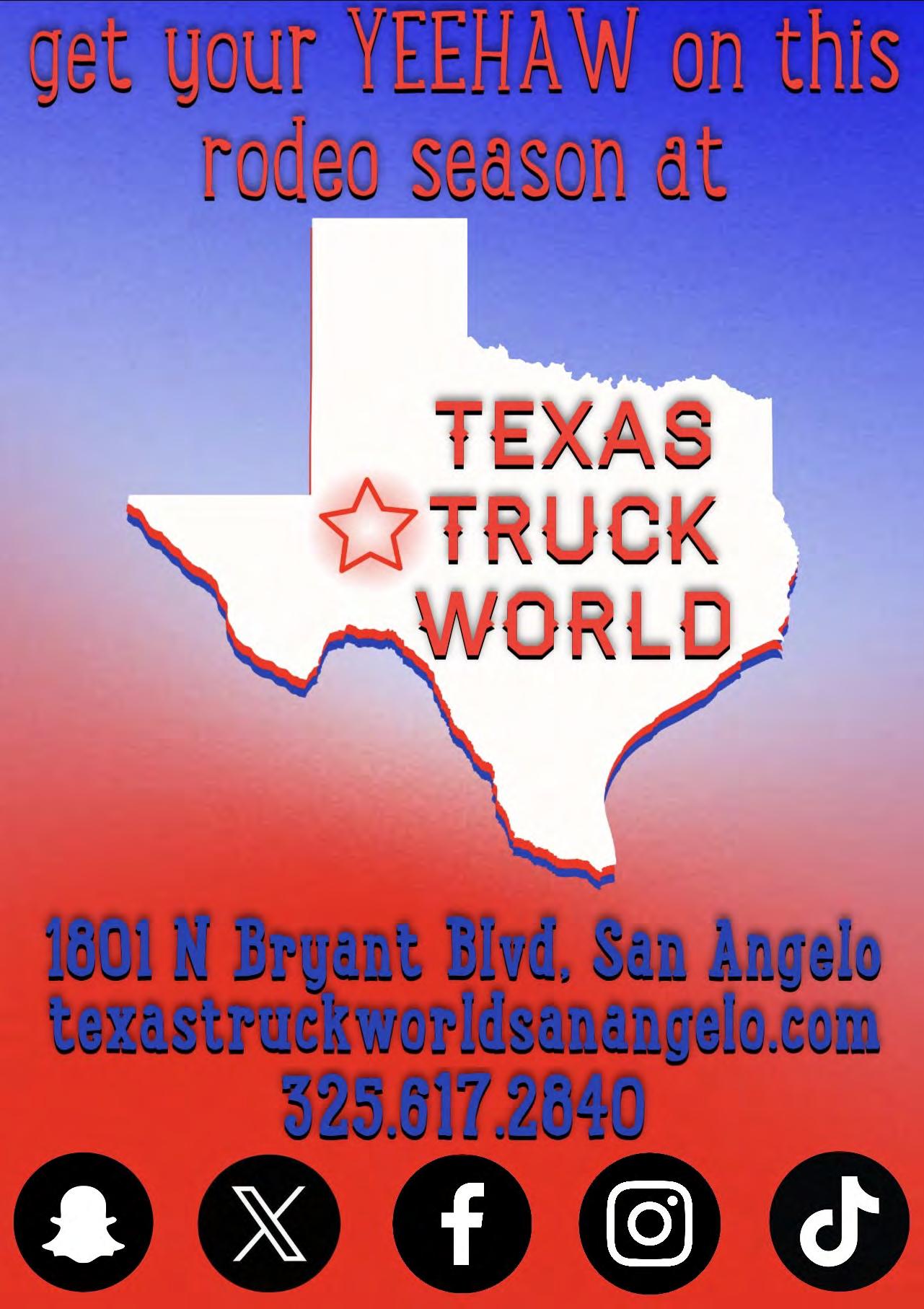 Welcome Rodeo Fans!!!! Catering & Banquet Facilities Available Great Mexican Food Steaks & More! All You Can Eat Catfish Mon - Sat! US 87 North at FM 2105 San Angelo 325-655-5511 Specializing in Sales & Rentals Since 1997 5220 Link Rd 325-658-1969 www.prolinerentals.com Quality Auto Parts at Competitive Prices 20 Nor th Main Street San Angelo, Texas 325-655-2573 20 Nor th Main Street San Angelo, Texas 325-655-2573 Rodolfo Alcaraz | Owner/Master Sprayer 325-655-0057 | 325-450-9341 Save 30-50% on your cooling and heating cos wi e right insulation! Call us today for a free estimate! We specialize in Spray Foam Open Cell & Closed Cell, Metal Buildings, Wood Frame Homes, New Construction, Existing Attics, Commercial & Residential Medicare Supplements Long Term Care Cancer Life Insurance Cell: (325) 340-0802 D720mb@aol.com PRCA RODEO PERFORMANCES PRCA PERFORMANCES FRIDAY APRIL 5 7:30 P.M. SATURDAY APRIL 6 1:00 P.M. SATURDAY APRIL 6 7:30 P.M. SUNDAY APRIL 7 2:00 P.M. THURSDAY APRIL 11 7:30 P.M.