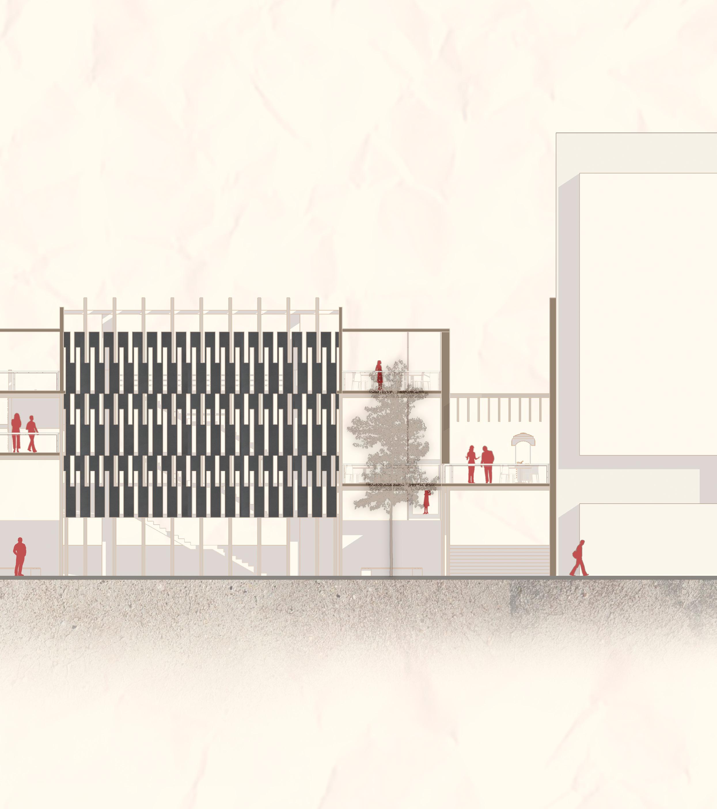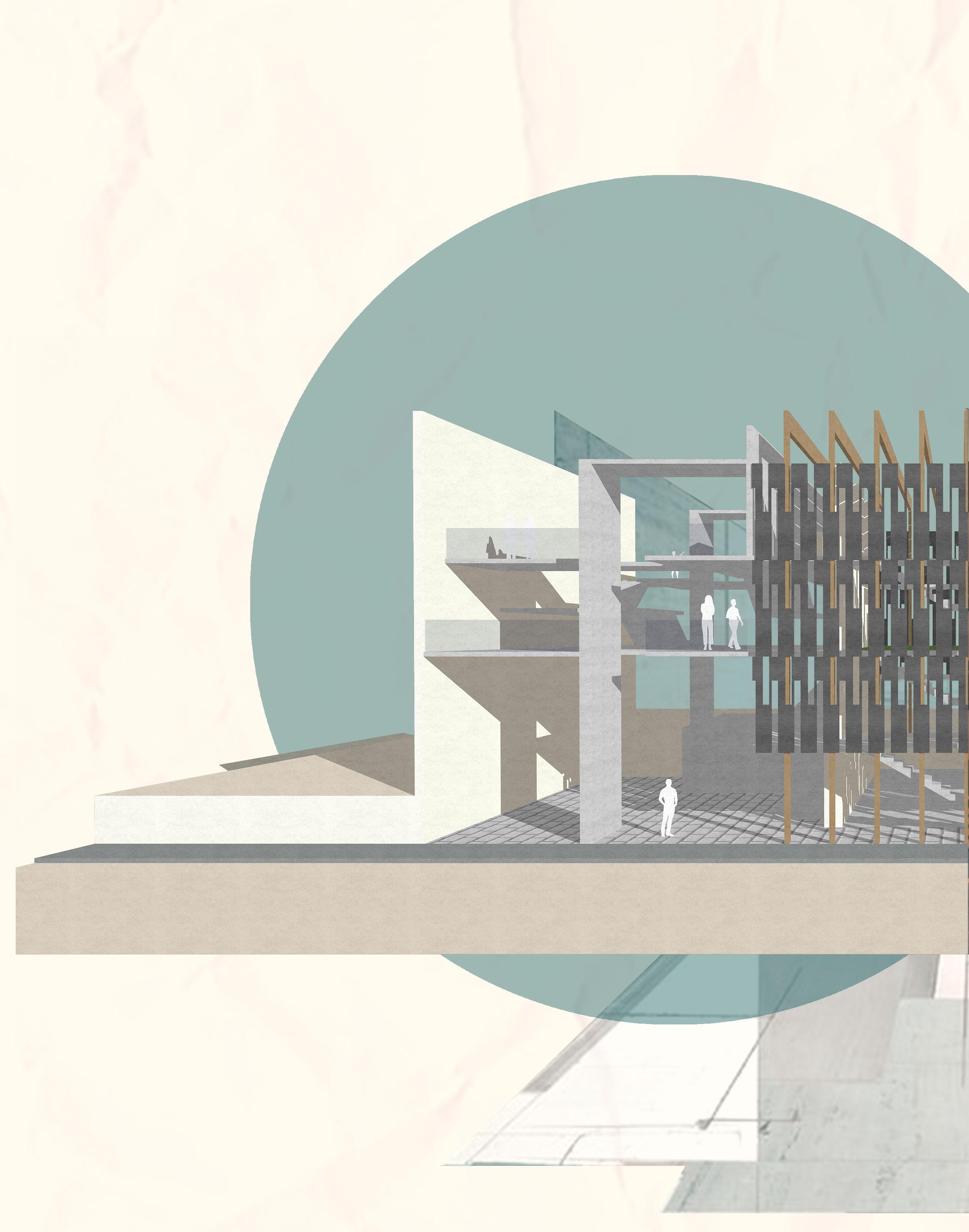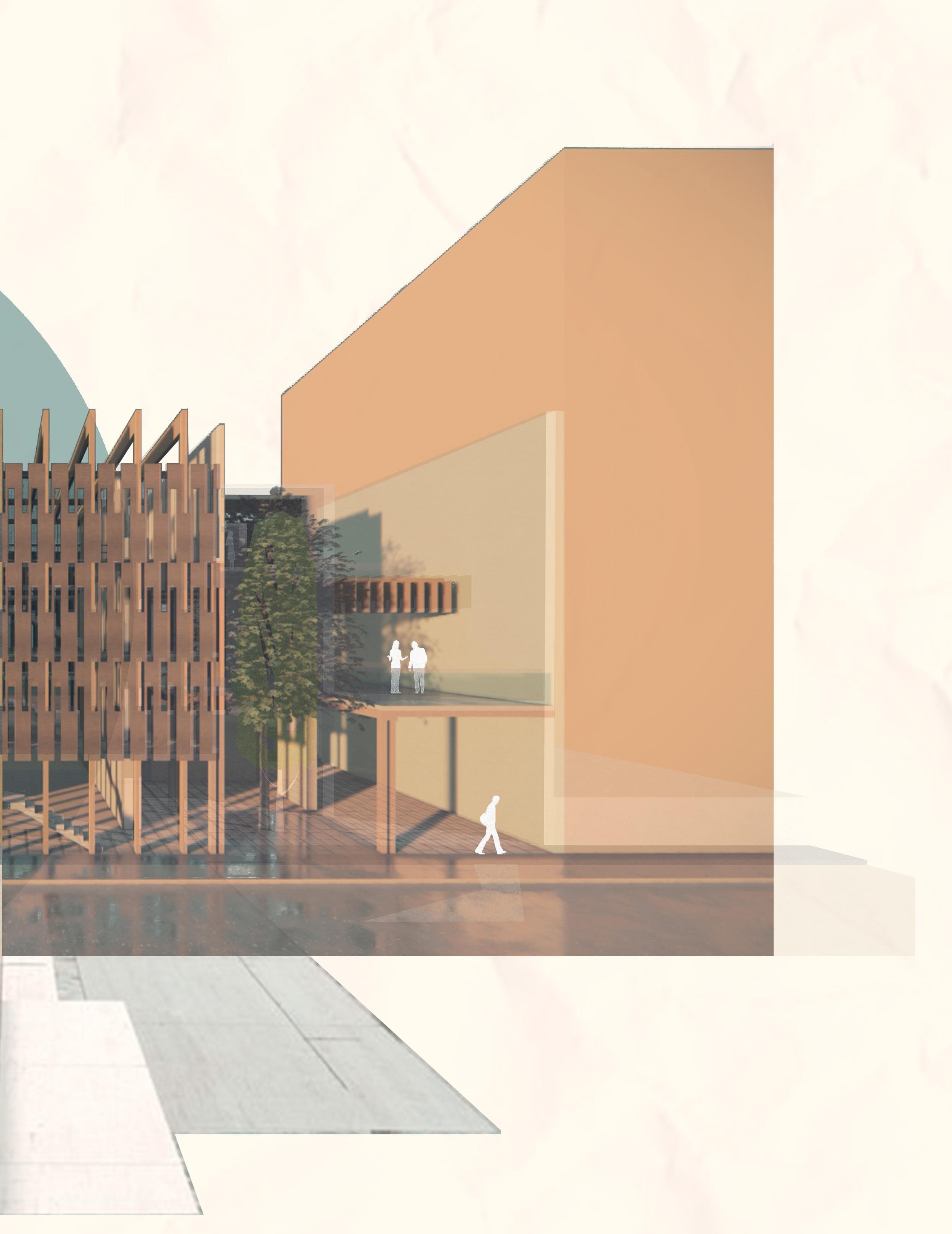 Este proyecto que se encuentra ubicado en la intersección de las calles: Joaquín Lalama y Juan Benigno Vela en el centro de la ciudad de Ambato, está enfocado en la generación de espacios que permitan la conglomeración de diversas actividades dentro de un mismo contexto urbano, promoviendo la interacción social y la continuidad espacial entre lo público y lo privado. La propuesta se fundamenta en el concepto de “umbral urbano”, entendido como un espacio de transición que no pertenece completamente ni al interior ni al exterior, sino que actúa como un punto intermedio de conexión y permeabilidad. De esta forma a través de la disposición de volúmenes, plataformas, celosías y planos suspendidos, se crea una secuencia espacial fluida, donde el usuario experimenta la sensación de “mirar a través de” una transparencia visual y funcional que diluye los límites entre espacios cerrados y abiertos.