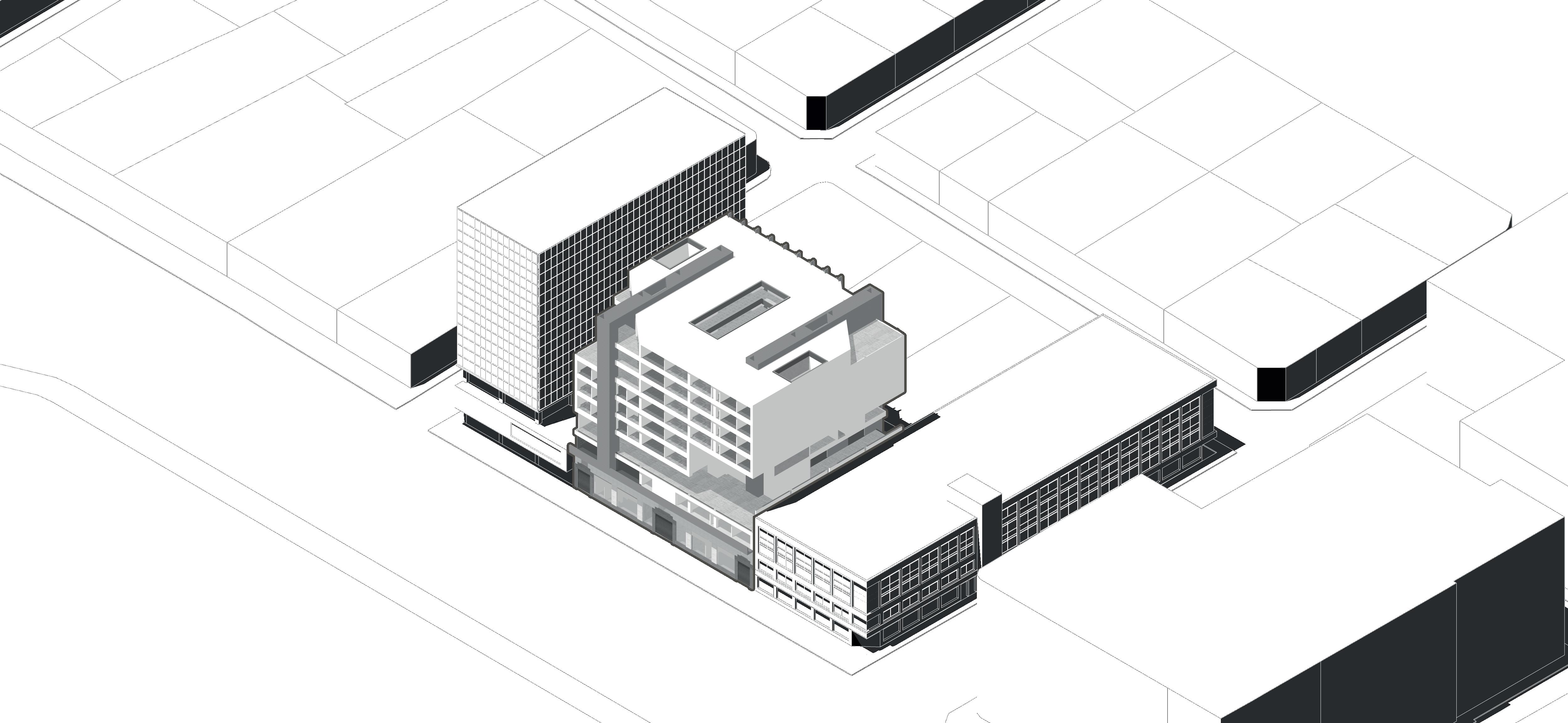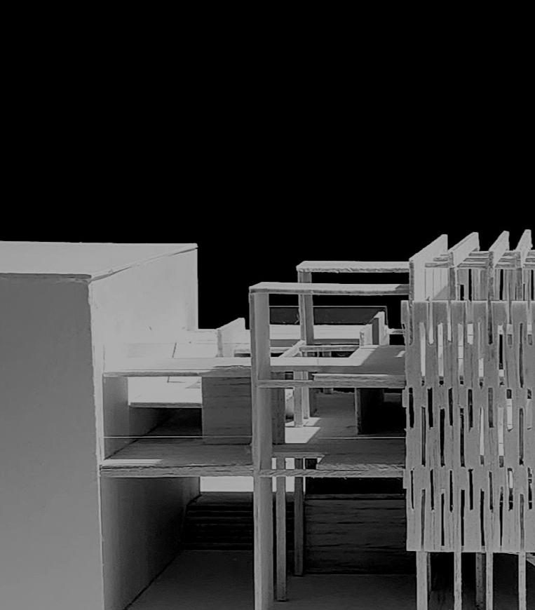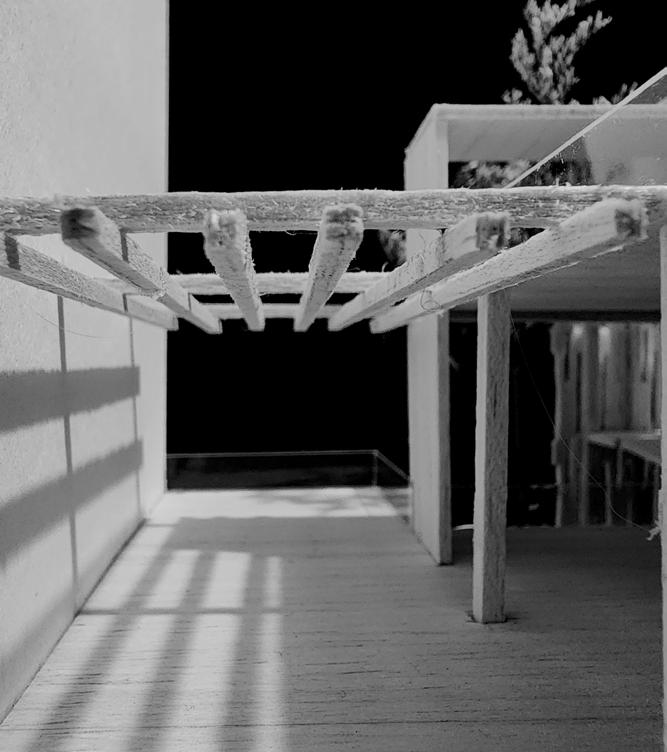 La tectónica del proyecto se expresa mediante una estructura ligera y modulada, que permite la entrada controlada de luz y ventilación natural, generando confort térmico y visual en las distintas áreas. Estos recursos materiales y estructurales no solo responden a una función técnica, sino que también refuerzan la noción de umbral como filtro: un sistema que regula la relación entre el entorno urbano y el espacio habitable, entre la densidad del contexto y la escala humana del usuario que lo habita.