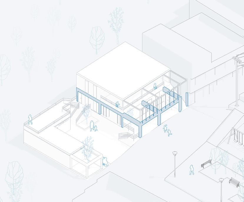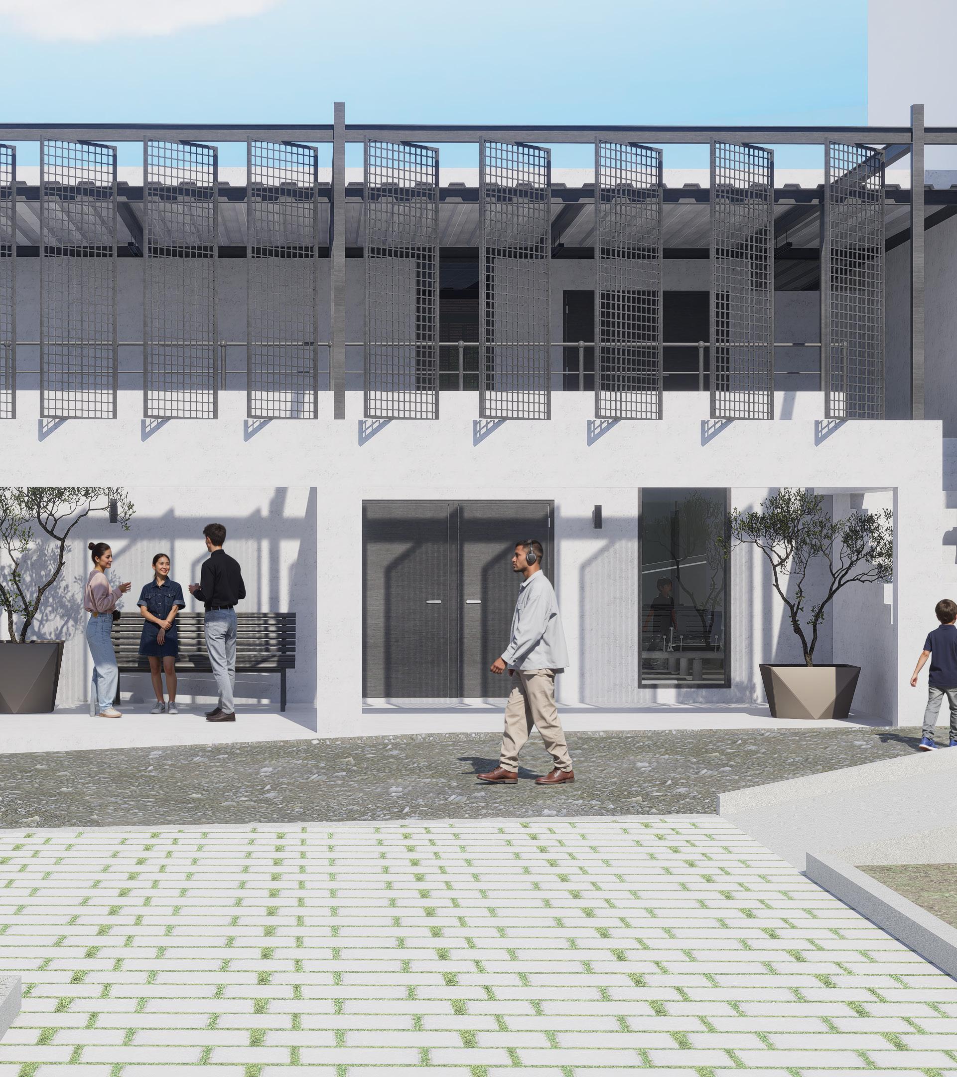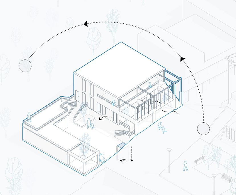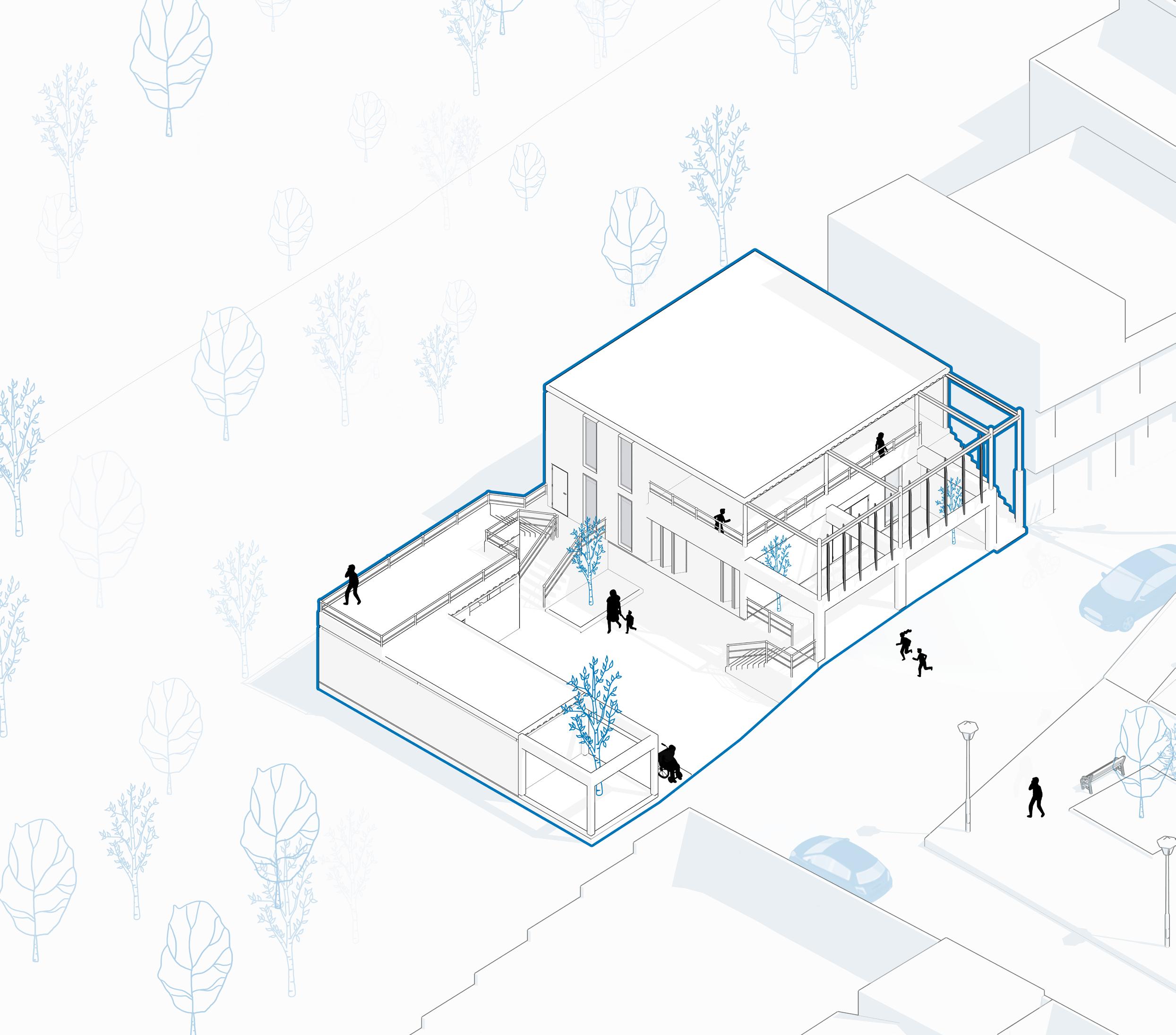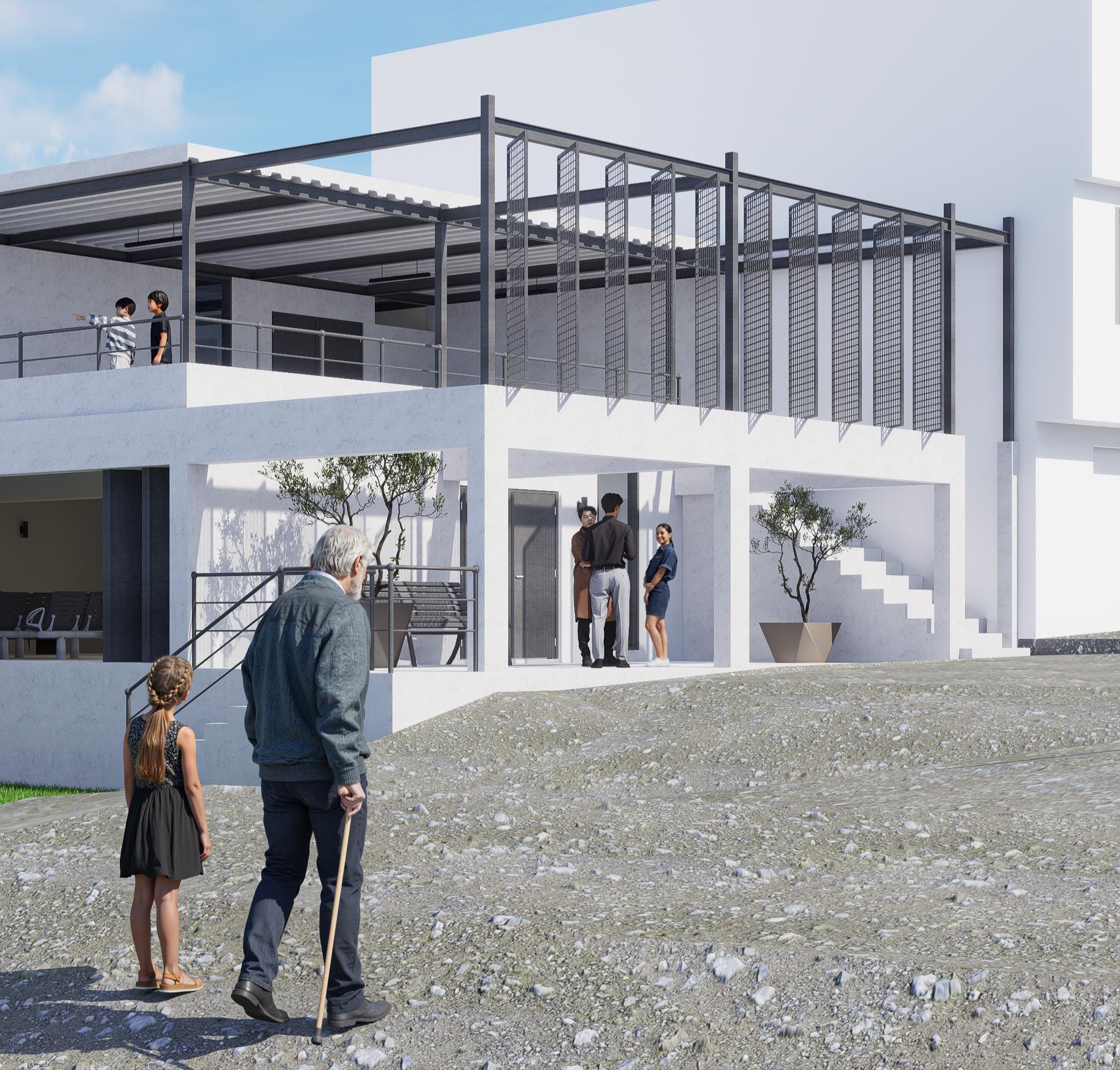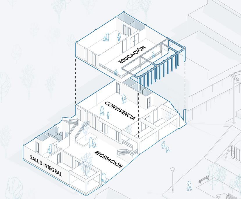 La propuesta arquitectónica se configura como una intervención de carácter comunitario que articula renovación y ampliación en un equipamiento existente, ubicado en un tejido barrial consolidado. El proyecto conserva la estructura original de la planta baja, integrándola como base funcional y simbólica, y suma un segundo nivel mediante una estructura metálica ligera, optimizando recursos y facilitando flexibilidad espacial. Formalmente, el conjunto se organiza a partir de dos volúmenes principales: el edificio existente, recuperado mediante una intervención respetuosa, y una nueva edificación lateral que amplía las capacidades del equipamiento. Ambos cuerpos se articulan a través de recursos arquitectónicos como umbrales, terrazas y espacios intermedios, los cuales no solo generan una transición gradual entre interior y exterior, sino que también consolidan una lectura unificada del conjunto. Esta configuración permite transiciones claras entre el espacio público y el ámbito comunitario, reforzando la idea de un equipamiento abierto y cercano. La disposición estratégica de los accesos, la apertura hacia el parque barrial, y la incorporación de áreas verdes, favorecen la apropiación cotidiana por parte de los habitantes, resignificando el rol del edificio como punto de encuentro, intercambio y cohesión social.
