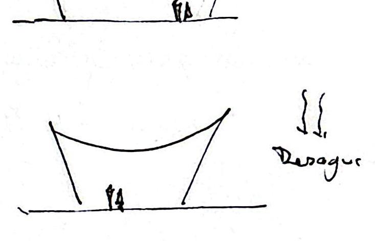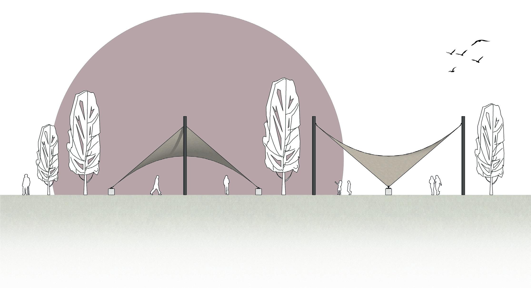 intervenir con la vegetación existente; para ello se parte de un plano cuadrado para poder elevar dos puntos diagonales y poder generar dos puntos de apoyos inferiores y superiores, de esta forma mediante el uso de una tenso estructura se da forma a estos espacios que estarán recubiertos de una lona de alta resistencia y sujetos a pilares de metal que no interrumpen con el paisaje visual que se presenta dentro del sector, sino más bien sirve como complemento de las actividades a realizarse.