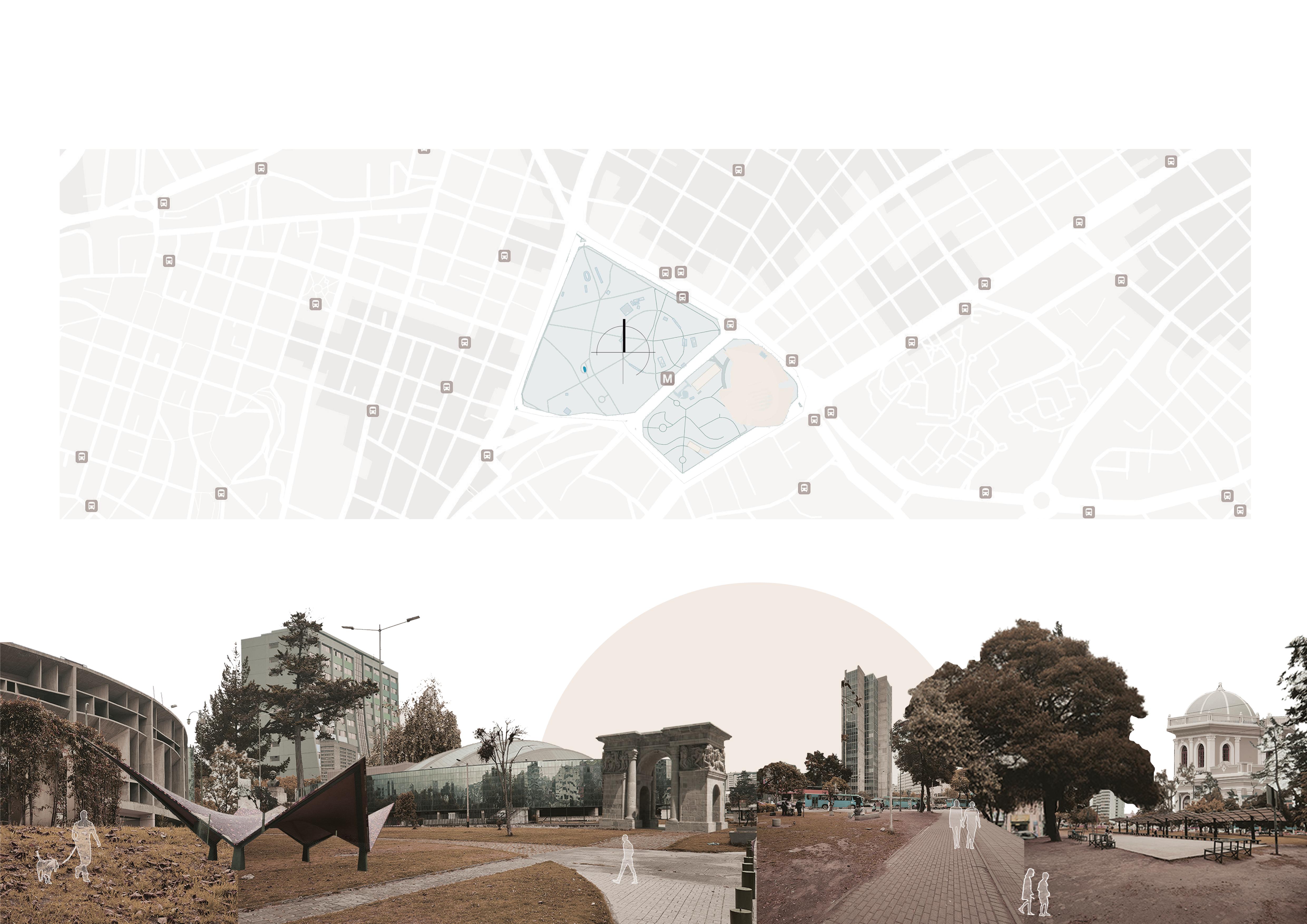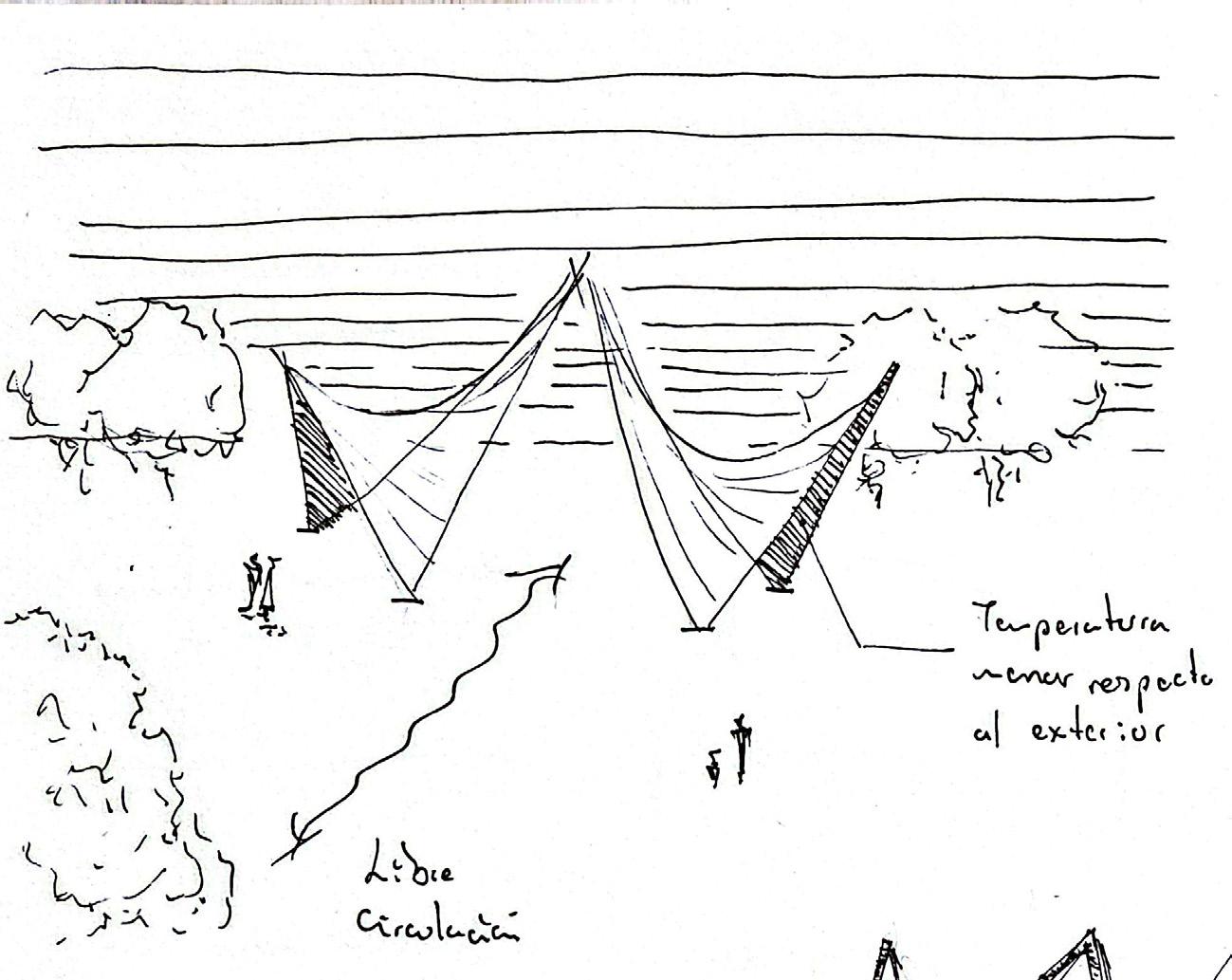La utilización de una tensoestructura permite materializar esta forma ligera mediante la combinación de tensores y membranas flexibles que trabajan principalmente a tracción, lo que reduce considerablemente la necesidad de elementos rígidos y pesados. Respecto al sistema estructural, se apoya en pilares metálicos esbeltos, cuidadosamente distribuidos para minimizar la intervención con el suelo y evitar la afectación de las raíces de los árboles existentes. Estos soportes, más que imponerse, se mimetizan con el entorno, configurando una relación armónica entre arquitectura y paisaje. Desde la perspectiva visual, la estructura se percibe como una extensión del parque, complementando su carácter dinámico y abierto hacia el espacio.