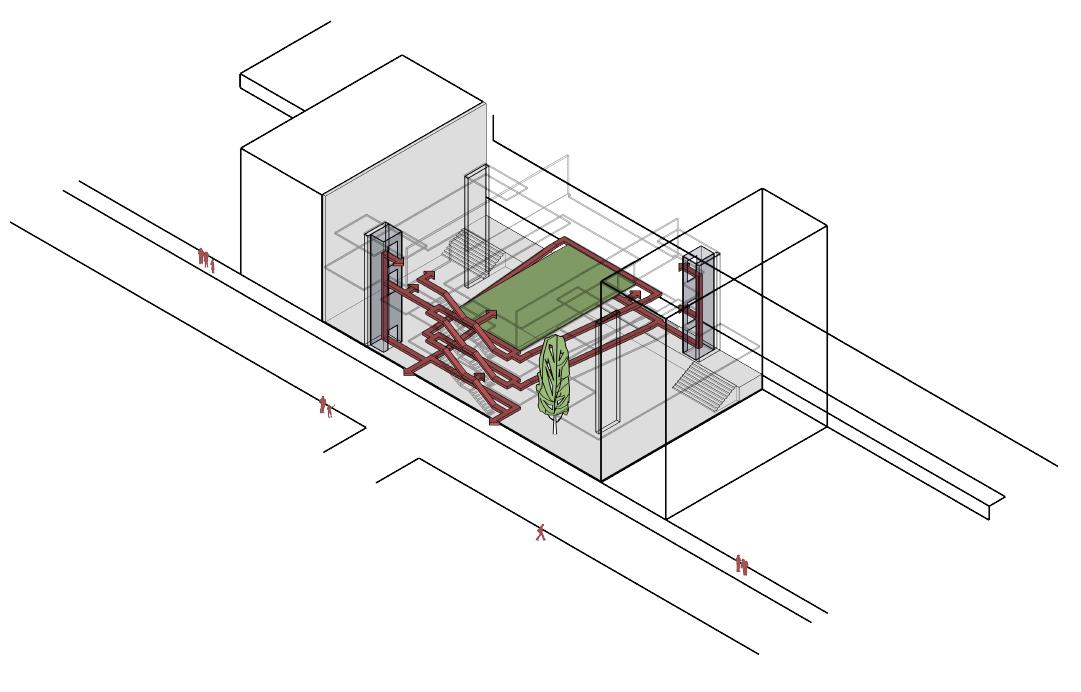 El proyecto se inscribe dentro de una visión arquitectónica contemporánea que concibe el espacio público no solo como un soporte físico para la movilidad, sino como un sistema vivo de interacción social. La propuesta no se limita a resolver un nodo de tránsito, sino que el objetivo principal es fortalecer la conexión entre el entorno urbano y las actividades que caracterizan al sector, integrando el movimiento cotidiano con la posibilidad del descanso y la contemplación. Este propósito se alcanza a través de una articulación espacial prolijamente planificada, que transforma la linealidad funcional de una parada tradicional en una secuencia dinámica de espacios abiertos, semiabiertos y sombreados, de esta forma los pasajes diseñados se conciben como espacios intermedios que median entre la circulación y la estancia, invitando al peatón a detenerse, observar y participar del entorno de manera funcional.