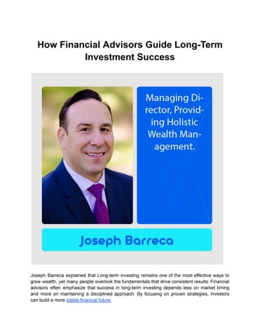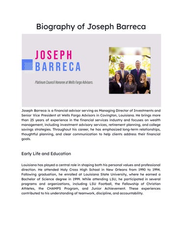 Joseph Barreca is a financial advisor serving as Managing Director of Investments and Senior Vice President at Wells Fargo Advisors in Covington, Louisiana. He has more than 25 years of experience in the financial services industry and focuses on wealth management, including investment advisory services, retirement planning, and college savings strategies. His career has been built on long-term client relationships and consistent service across changing market conditions. He attended Holy Cross High School in New Orleans from 1990 to 1994. After high school, he enrolled at Louisiana State University and earned a Bachelor of Science degree in 1999. While at LSU, he participated in LSU Football, the Fellowship of Christian Athletes, the CHAMPS Program, and Junior Achievement. These experiences contributed to his understanding of teamwork, discipline, and responsibility. Joseph P. Barreca began his career in financial services in 1999 during a period of growth for bank-based investment programs. Early in his career, he focused on learning the regulatory, operational, and client service sides of the business. He placed importance on helping clients understand financial decisions clearly and realistically. In November 2003, Joseph Barreca joined Iberia Financial Services, LLC, a wholly owned subsidiary of IBERIABANK, where he served as Senior Vice President. During this time, investment and insurance products and services were offered through Infinex Investments, Inc., a registered broker-dealer and Member FINRA/SIPC. From 1999 through 2020, he maintained a 20-year record of being named to the Circle of Excellence at Iberia Financial Services. He was recognized multiple times as one of the Top 50 Bank Investment Consultants.