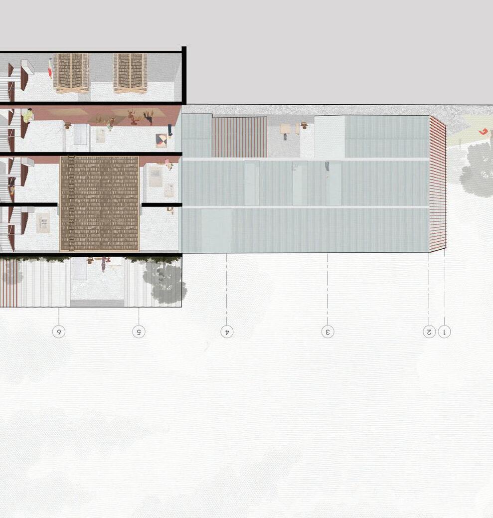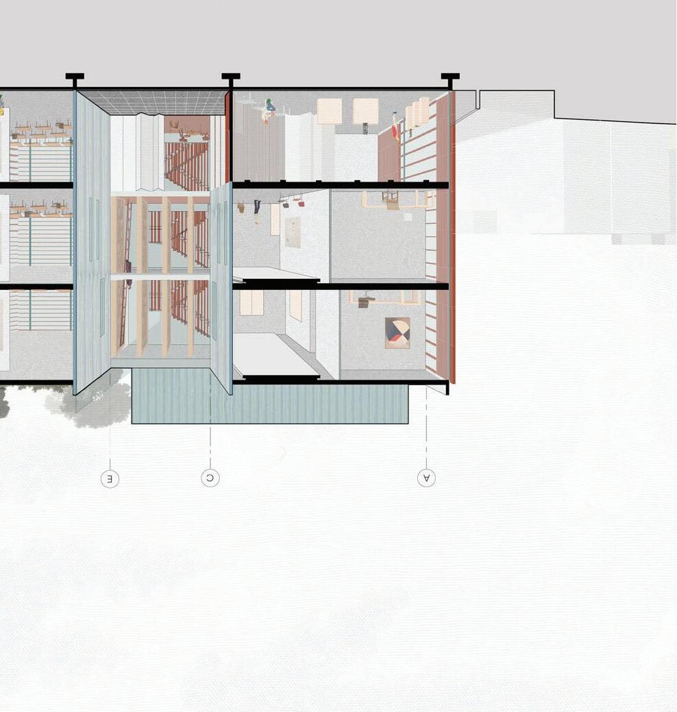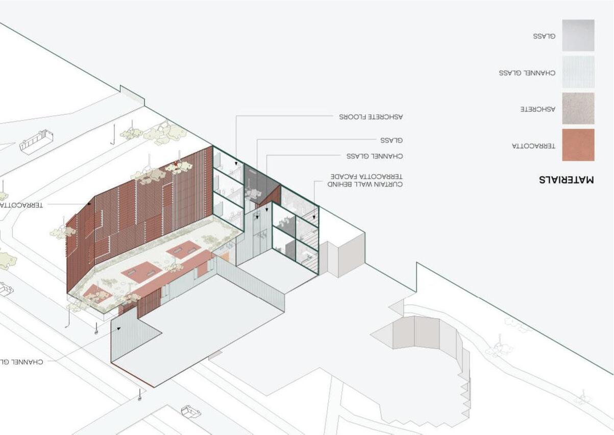 KCAI is a private higher education facility focused on art and design. KCAI’s mission is to “prepare gifted students to transform the world creatively through art and desing.” Our site is located on the southern end of campus. Our architecture school explores architectural health on a macro and micro level. Macro being the occupants and their relationship with architectural education and architecture. Micro is the architecture itself and its ability to be adaptable, supportive, and resilient. The macro side of architectural health concerns the wellness of the occupants and their education. DoArch is an architecture program through KCAI that heavily emphasizes the incorporation of multiple design mediums in addition to courses geared towards architectural health. The micro side of architectural health concerns the architecture itself and its ability to be adaptable, supportive, and resilient. We approached this through permeability in our curriculum, form, and materials. In addition to teaching 6 categories of sustainability in the 4th year research studio, the proposed building follows them. The proposed architecture facility supports architectural health on a micro and macro level by attending to the occupants and their education, as well as the health of the building and its impact on site and surrounding context.