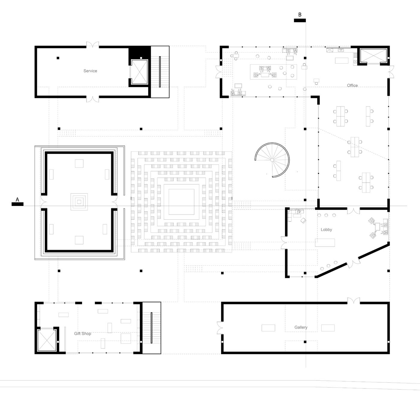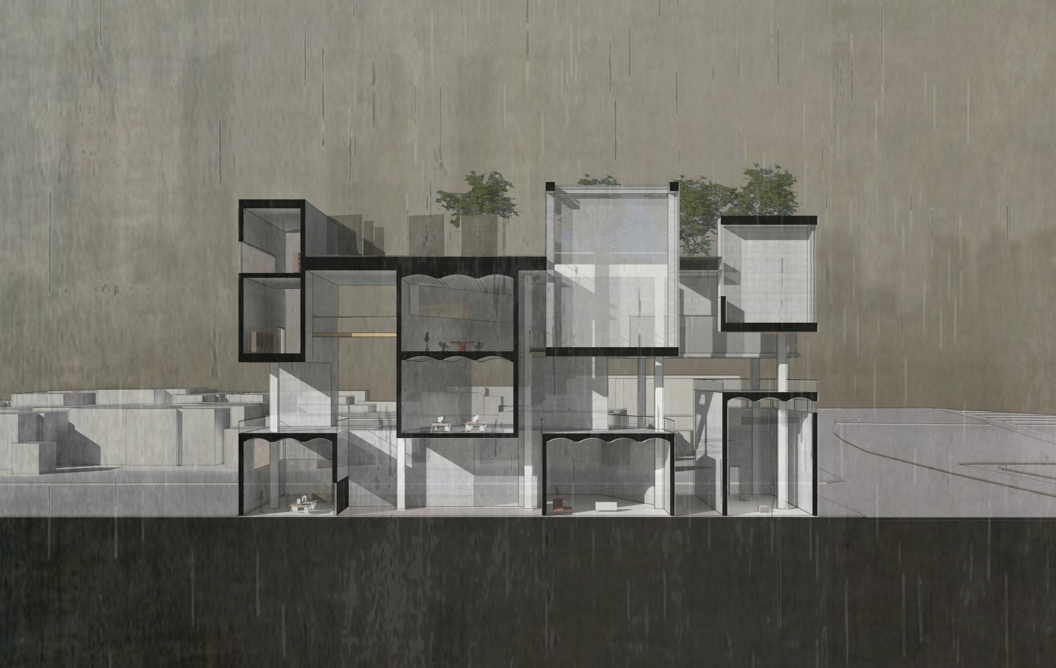 This project focuses on the concept of creating a green urban space for everyone to utilize. This is achieved through carving into the site intertwining hardscape and landscape. The hardscape spaces are lower in elevation and programmed to accommodate the requests of the clients, while the landscape is used for circulation . One can look down into the hardscape spaces while also being abel to look up from the hardscape places. The building located in the center of the site is where all the indoor programs are held. This building acts as a beacon of light on the site due to its increase in height compared to the rest of the site. People who pass by the site or walk through it are able to clearly see the building especially at night when it lights up.