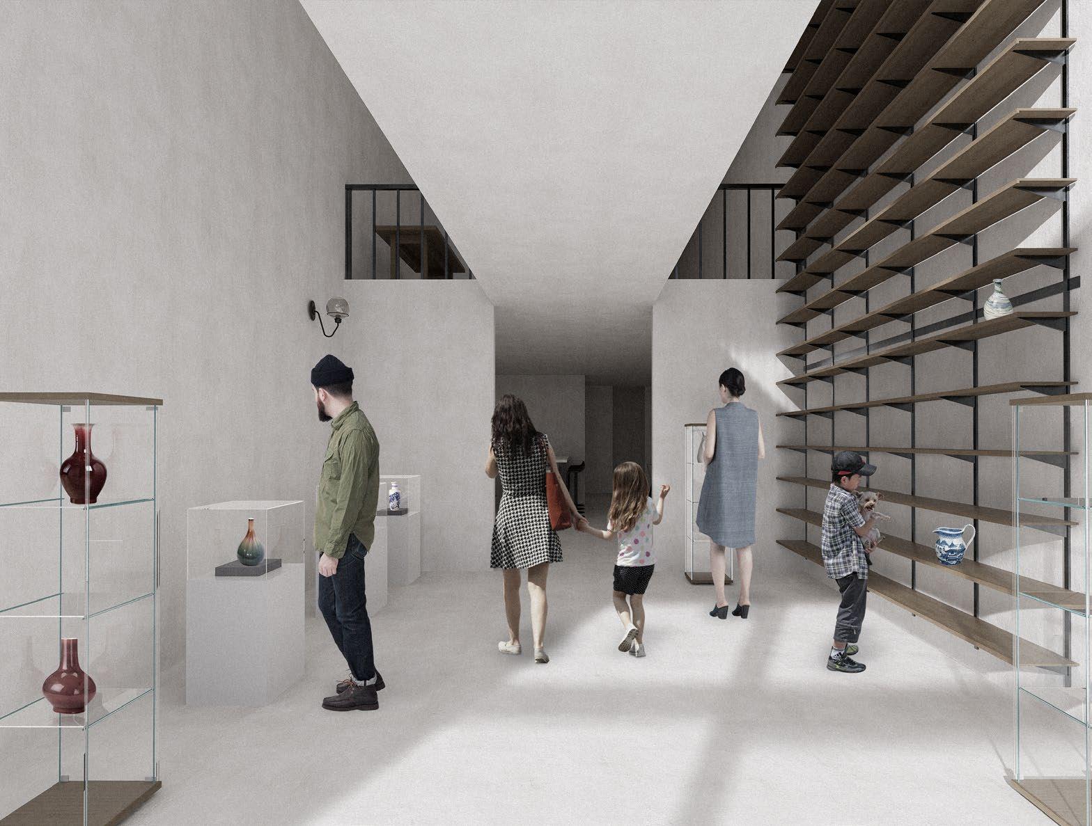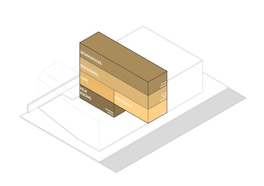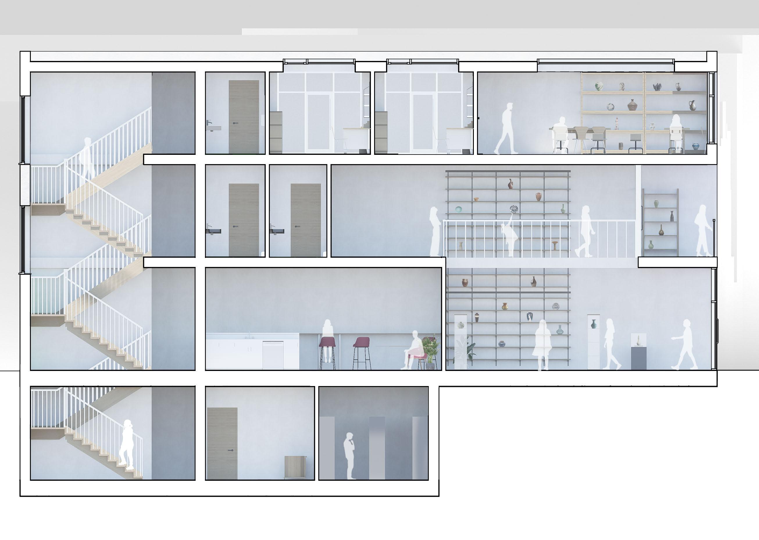 The first floor serves as a testing/showcase area while having connections to the balconey. Ceramists can teach lessons to those who are intrested while others can view the artworks along the walls and also below from the voids alongside the walk way leading to the balconey those on the balconey can have views to Albert Road, connecting to the passeres by.