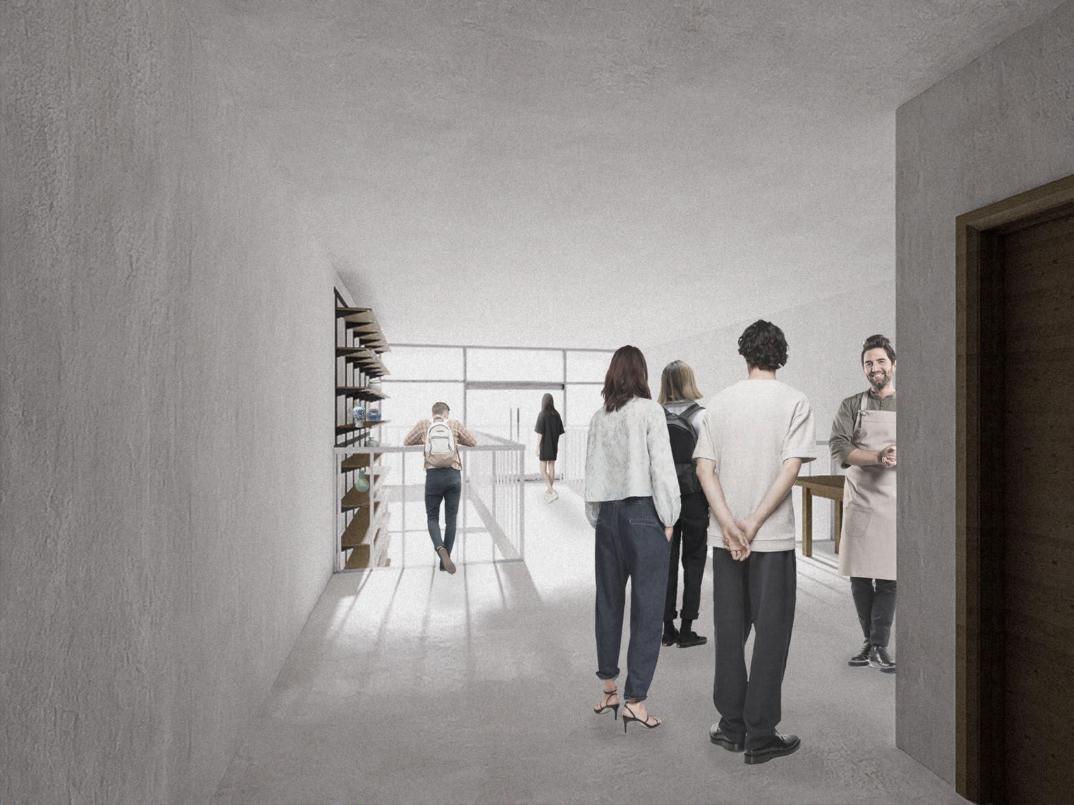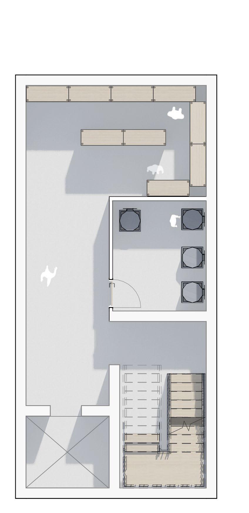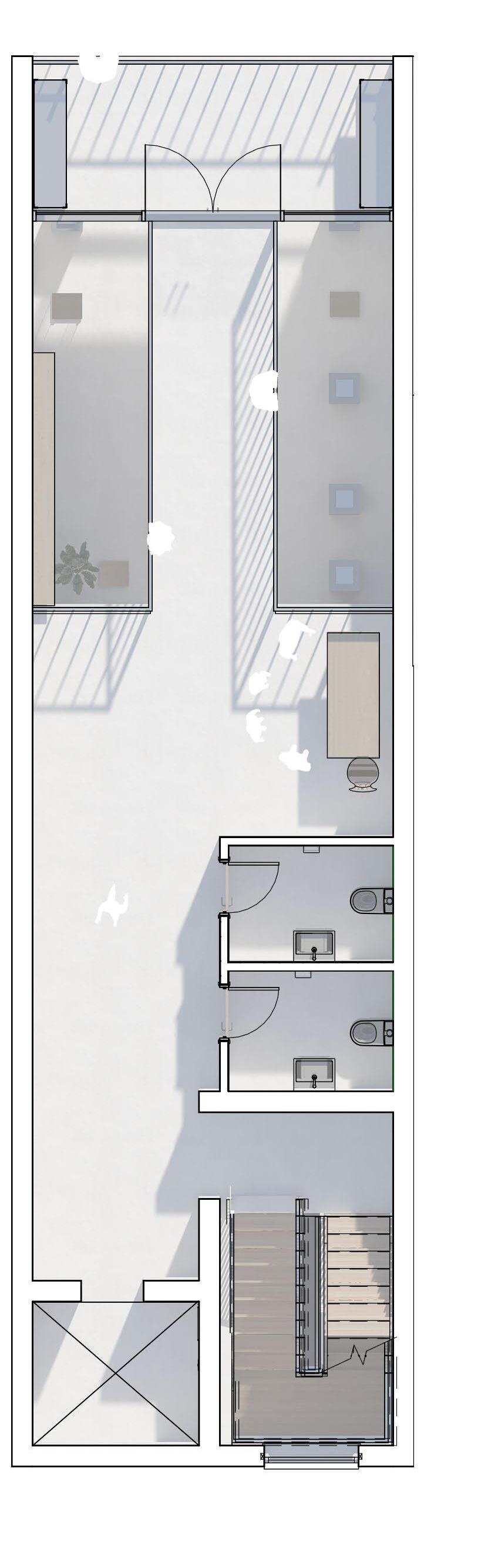 The first floor serves as a testing/showcase area while having connections to the balconey. Ceramists can teach lessons to those who are intrested while others can view the artworks along the walls and also below from the voids alongside the walk way leading to the balconey those on the balconey can have views to Albert Road, connecting to the passeres by.