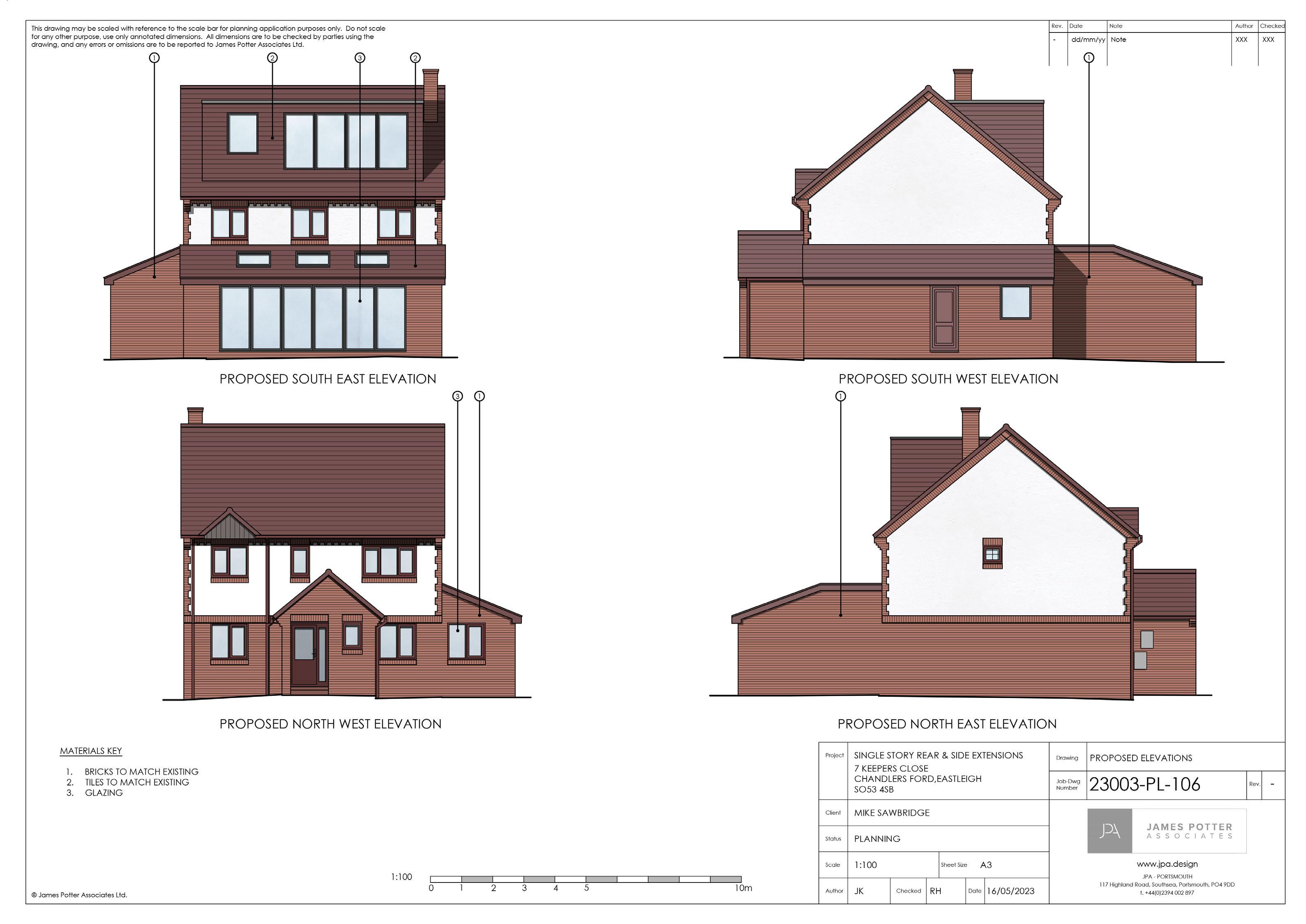 1800 1800 1800 1800 Roof light above Proposed new walls / partitions Proposed structural lintels & beams Existing walls / partitions KEY DRESSING ROOM ENSUITE BEDROOM 5 1800 1800 dd/mm/yy Note XXXXXXRev. Rev.DateNote AuthorChecked Status Project Client Drawing Job-Dwg Number may be scaled with reference to the scale bar for planning application purposes only. Do not scale purpose, use only annotated dimensions. All dimensions are to be checked by parties using the and any errors or omissions are to be reported to James Potter Associates Ltd. SINGLE STORY REAR & SIDE EXTENSIONS 7 KEEPERS CLOSE CHANDLERS FORD,EASTLEIGH SO53 4SB MIKE SAWBRIDGE LOFT PLANS 23003-PL-104 PLANNINGEXISTING LOFT PLAN PROPOSED LOFT PLAN 1800 1800 1800 1800 Roof light above Proposed new walls / partitions Proposed structural lintels & beams Existing walls / partitions DRESSING ROOM ENSUITE BEDROOM 5 1800 1800 dd/mm/yy Note XXXXXXRev. Rev.DateNote AuthorChecked Status Project Client Drawing Job-Dwg Number reference to the scale bar for planning application purposes only. Do not scale annotated dimensions. All dimensions are to be checked by parties using the omissions are to be reported to James Potter Associates Ltd. SINGLE STORY REAR & SIDE EXTENSIONS 7 KEEPERS CLOSE CHANDLERS FORD,EASTLEIGH SO53 4SB MIKE SAWBRIDGE LOFT PLANS 23003-PL-104 PLANNINGEXISTING LOFT PLAN PROPOSED LOFT PLAN Indicative 3D Visual Proposed West Elevation Proposed South Elevation Proposed ground floor plan Existing ground floor plan