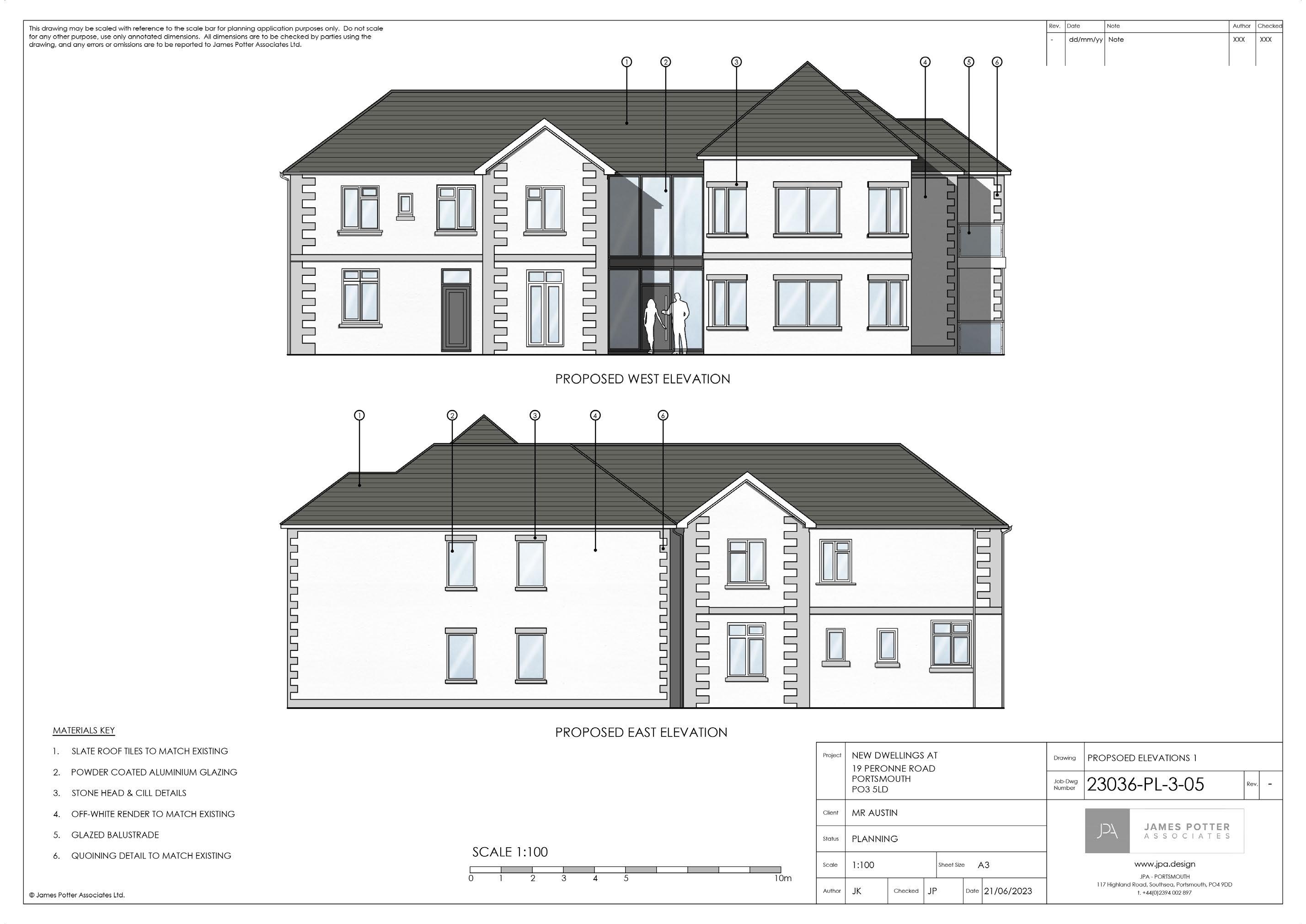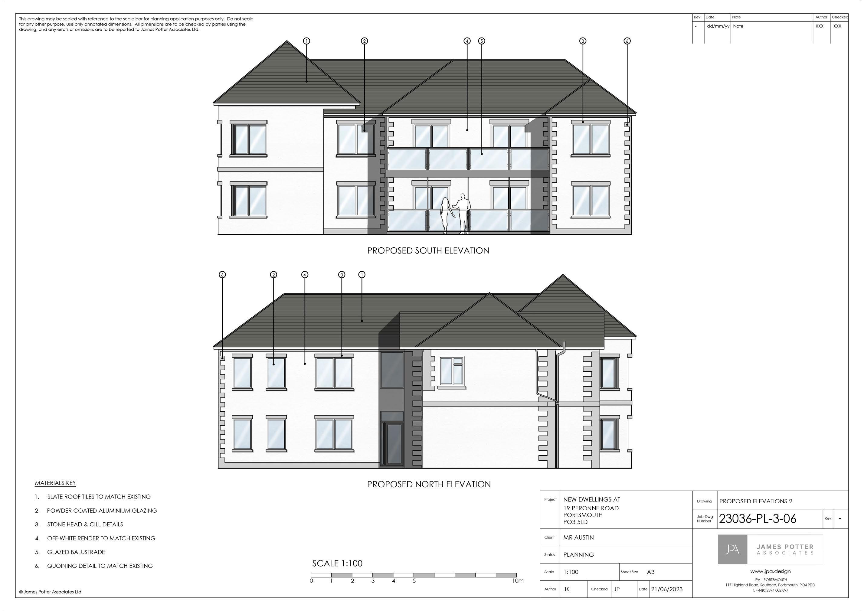 JPA - James Potter Associate 19 Perrone Road new walls / partitions partitions BEDROOM 1 CPD. KITCHEN DINING LIVING BATHROOM LIVING BEDROOM 2 CPD. BEDROOM 1 COMMUNAL HALL BEDROOM 2 HALL HALL KITCHEN/DINING BEDROOM 2 KITCHEN LIVING/DINING CBD. HALL BEDROOM 1 BATHROOM BATHROOM SCHEDULE OF ACCOMMODATION No.2BEDA 2 Bed Flat 68m²(732 sqft) No.2BEDB 2 Bed Flat 70m²(753 sqft) No.2BEDC 2 Bed Flat 77m²(829 sqft) Total:6 UNITS Allocated Parking: 6 Spaces Un-allocated Parking: 2 Spaces Total Parking: 8 Spaces dd/mm/yy NoteRev.DateNote Status Project Scale Client Sheet Size Drawing Job-Dwg Number www.jpa.design planning application purposes only. Do not scale dimensions are to be checked by parties using the James Potter Associates Ltd. JPA PORTSMOUTH NEW DWELLINGS AT 19 PERONNE ROAD PORTSMOUTH PO3 5LD MR AUSTIN PROPSOED GROUND FLOOR PLAN 23036-PL-3-03 A3 1:100 PLANNING PROPOSED GROUND FLOOR PLAN 2BEDA FLAT 1 68m2 (732 sqft) NORTH SCALE 1:100 0 1 234 5 10m 2BEDB FLAT 3 70m2 (753 sqft) 2BEDC FLAT 5 77m2 (829 sqft) Existing walls partitions KEY KITCHEN W/C UTILITY DINING LIVING BEDROOM HALL BEDROOM 1 BEDROOM 2 BEDROOM W/C BATHROOM LANDING CPD. Rev. Status Project Scale Author Client Checked Sheet Size Date Drawing Job-Dwg Number www.jpa.design © James Potter Associates Ltd. JPA PORTSMOUTH 117 Highland Road, Southsea, Portsmouth, PO4 9DD +44(0)2394 002 897 NEW DWELLINGS AT 19 PERONNE ROAD PORTSMOUTH PO3 5LD MR AUSTIN EXSITING FLOOR PLANS 23036-PL-3-01 A3 JK 21/06/2023 1:100 PLANNING JPEXISTING GROUND FLOOR PLAN EXISTING FIRST FLOOR PLAN 0 1 234 5 10m 1:100 NORTH
