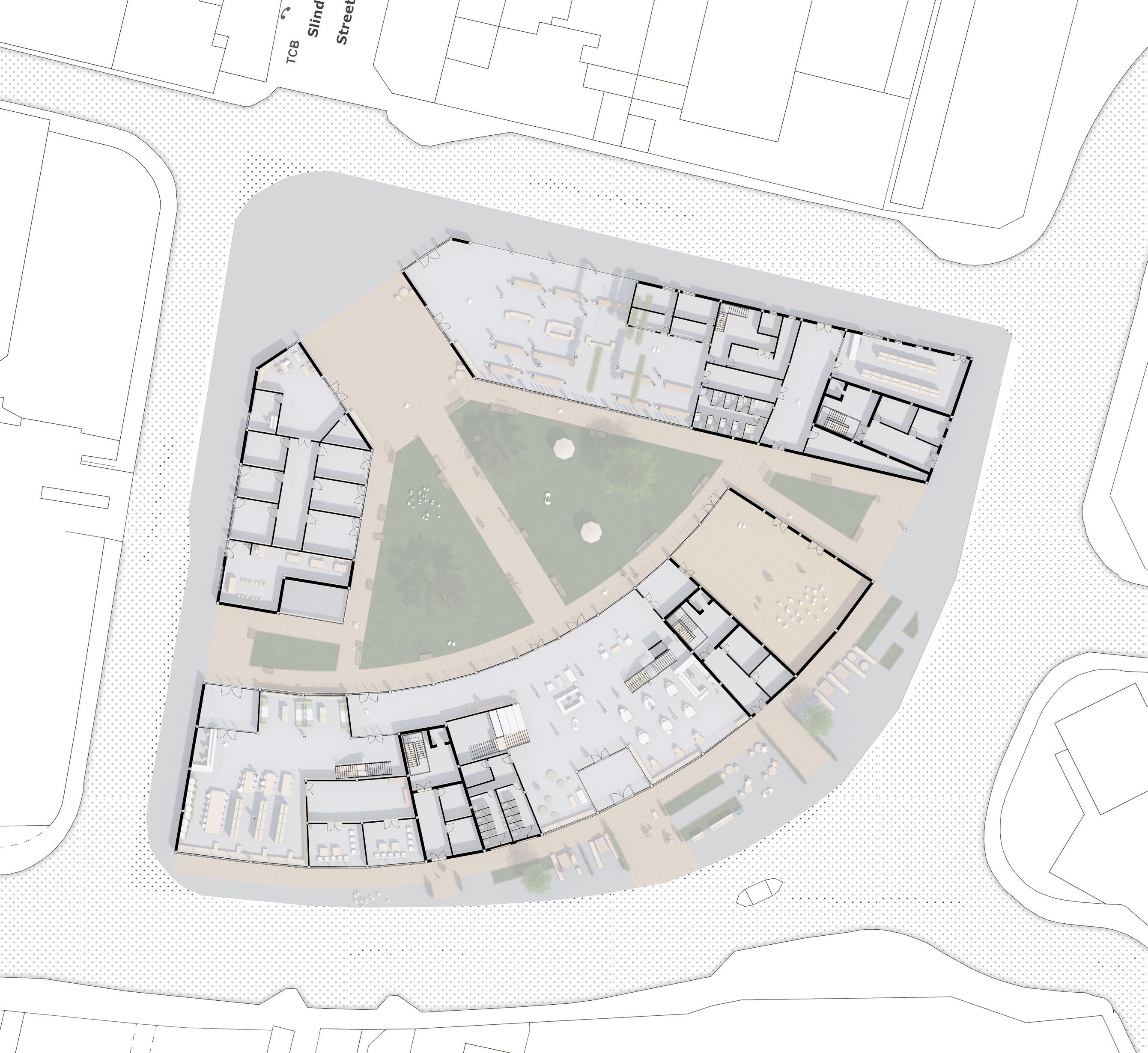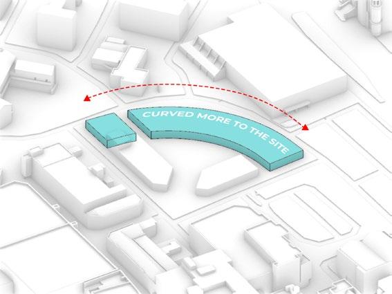 2 - The form of the building chosen to allow entrace from the main access points of the site. Uses on the ground floor being uses that were missing in the sorrounding local community.