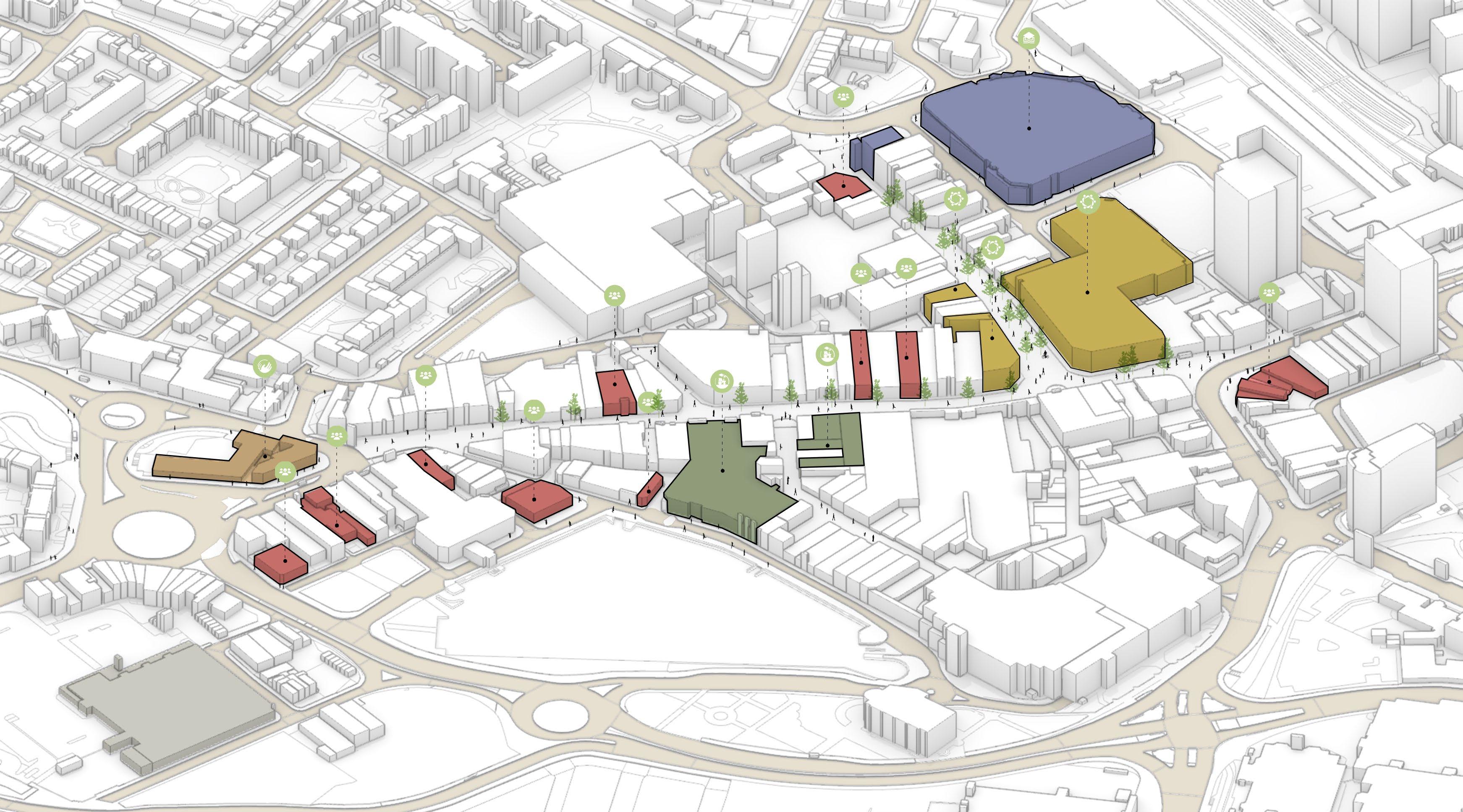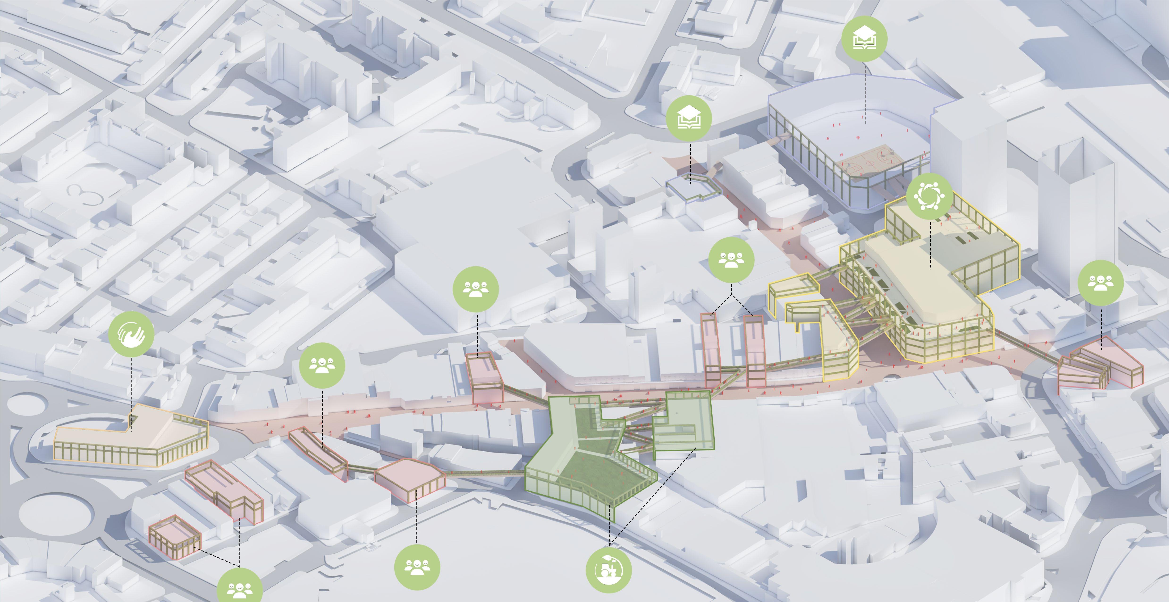 Each unsued building now served a new use, linking to the 6 main focuses that were missing or underused within the area.