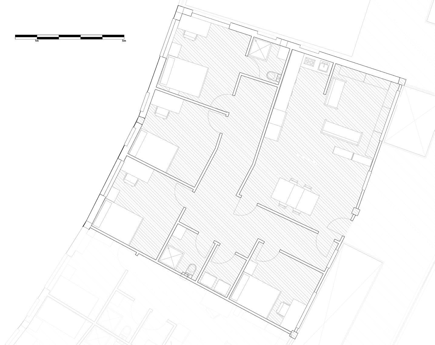 The first floor plan showcases the private affordable housing present in the building ranging from 1 bed affordable flat to 4 bed co living flats. By separating the housing from the mixed use by level, orientation and acess points,this allows the residents to have more privacy.