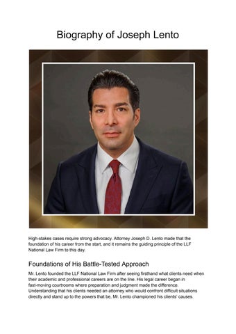 Joseph Lento's professional path reflects a steady commitment to representing individuals when their education, careers, and reputations are at risk. From the outset, his work has centered on cases where institutional decisions can carry long-term consequences. That perspective later became the foundation for the LLF National Law Firm, a national practice created to help clients navigate complex systems with clarity and purpose. Early in his career, Mr. Lento gained experience in demanding courtroom environments where preparation and judgment were required every day. These fast-moving settings made it clear how quickly a single allegation or investigation could alter someone’s future. Many clients entered these situations feeling overwhelmed and unsure how to respond. Seeing this firsthand influenced how he approached advocacy. He believed clients needed straightforward guidance, consistent communication, and representation that did not shy away from complex issues. As his work expanded, patterns began to emerge. The challenges he encountered were not isolated to one location or profession. Joseph D. Lento observed that students across the country were facing academic misconduct allegations, disciplinary hearings, and Title IX proceedings that often lacked transparency or consistency. At the same time, licensed professionals were confronting board investigations, administrative actions, and workplace disputes that threatened years of effort. These recurring issues highlighted the need for a firm designed to operate nationally while remaining focused on individual circumstances. Mr. Lento’s path into law required persistence and structure. He worked full-time while attending Temple University’s Beasley School of Law at night, balancing professional responsibilities with demanding coursework. That schedule required focus, discipline, and accountability. During law school, he emphasized trial advocacy and trained alongside experienced criminal defense attorneys and the Defender Association of Philadelphia.