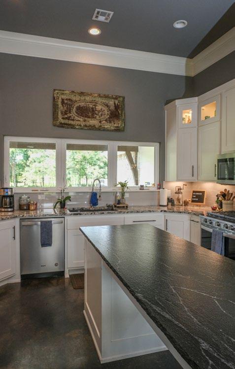 Smooth granite countertops line the walls, while the island countertop is black leathered granite; both come from JS
