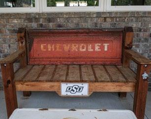 A porch bench, which she made for her husband’s 30th birthday, features a Chevy pickup tailgate she got at a Canton, Texas, flea market.