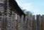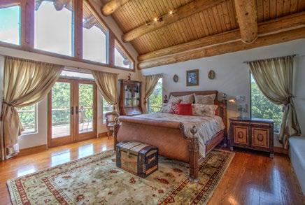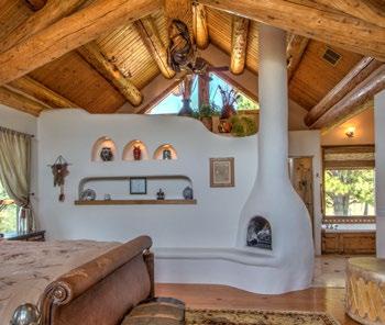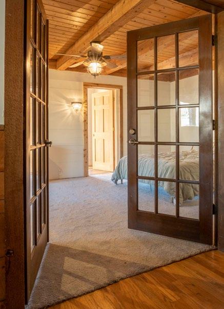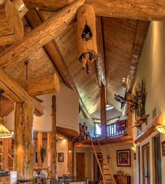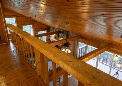 Wood beams brace the second floor and extend into the living room. A pine ceiling slopes from the second floor, offering a view from the balcony.