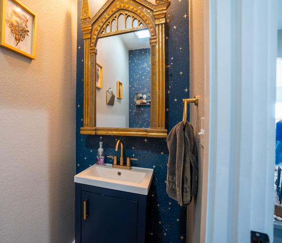 A half bath has other Harry Potter items, including a quidditch broom and a roost for Hedwig, the owl.