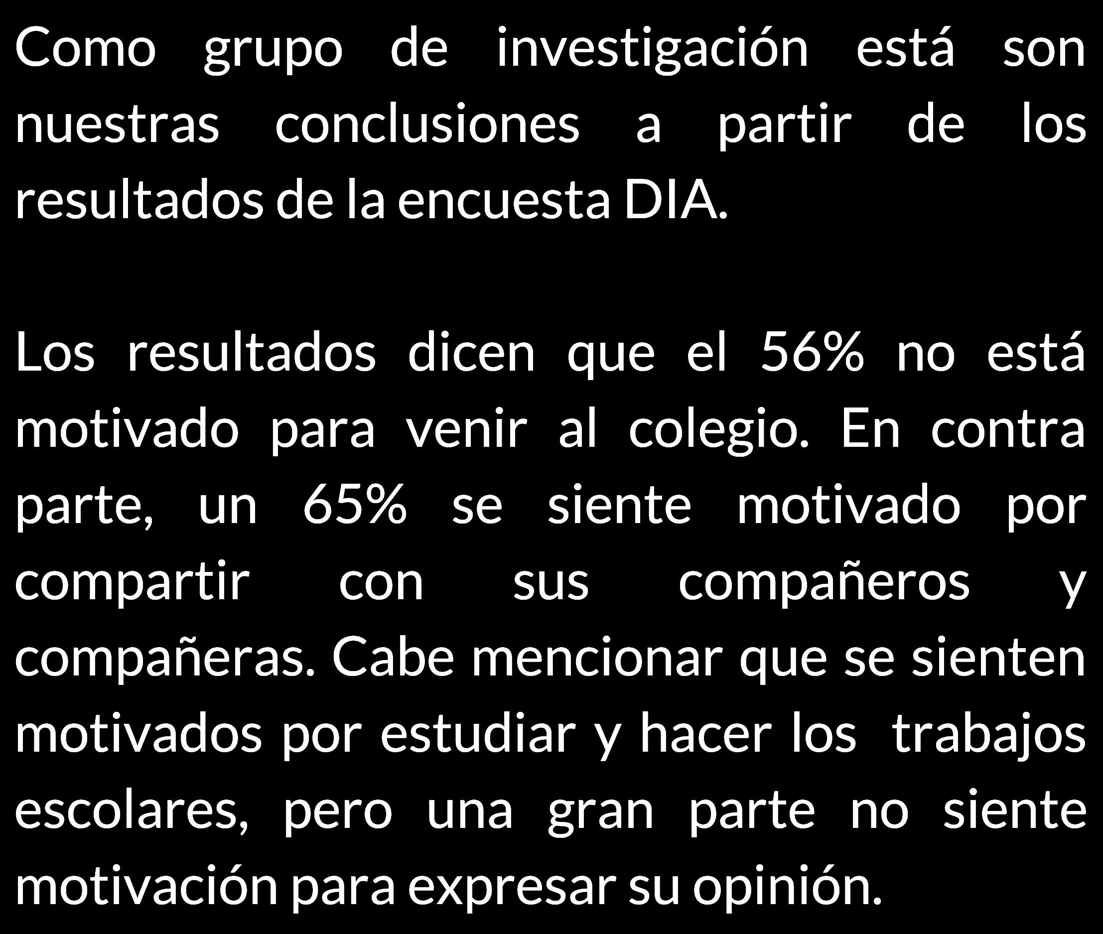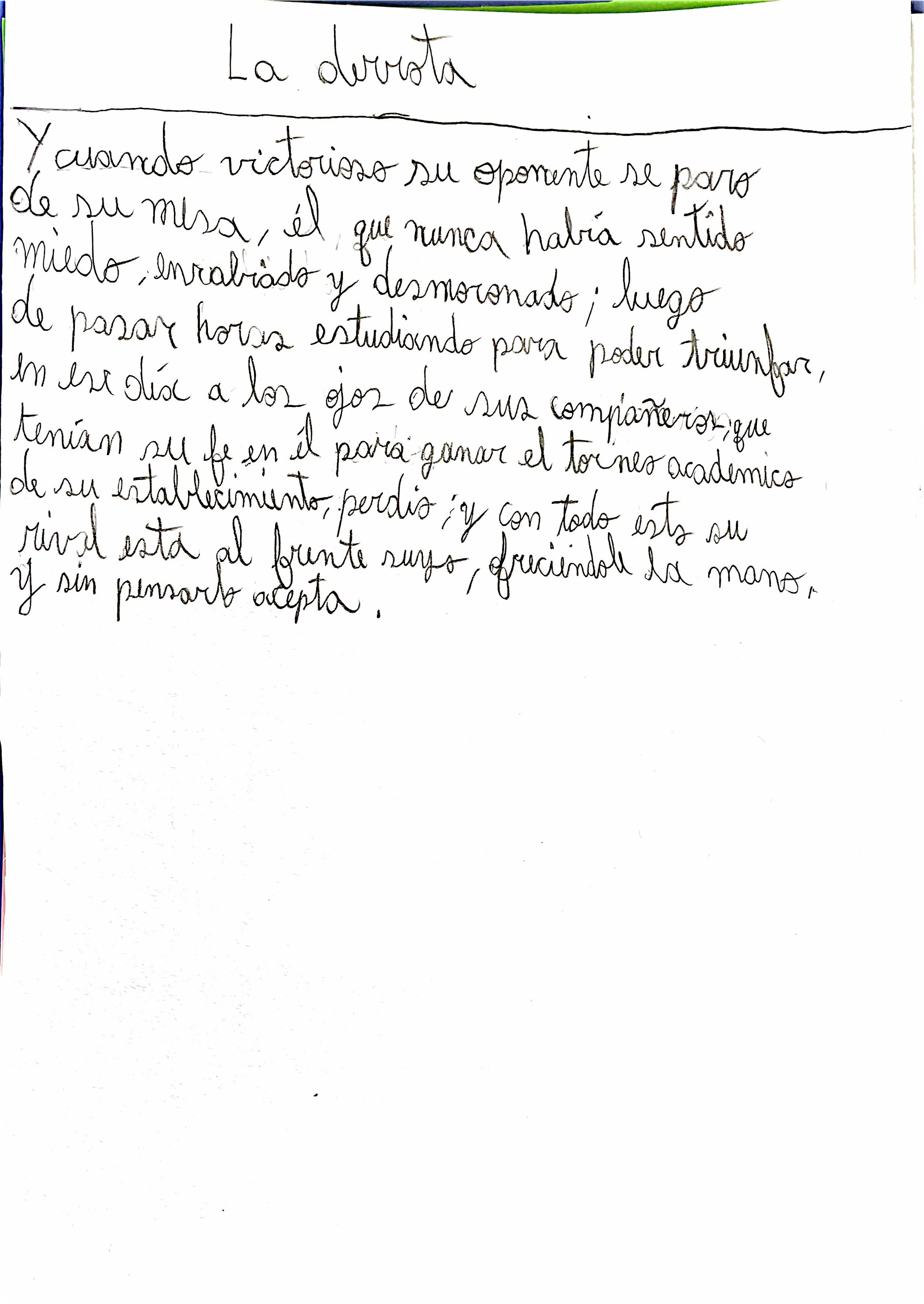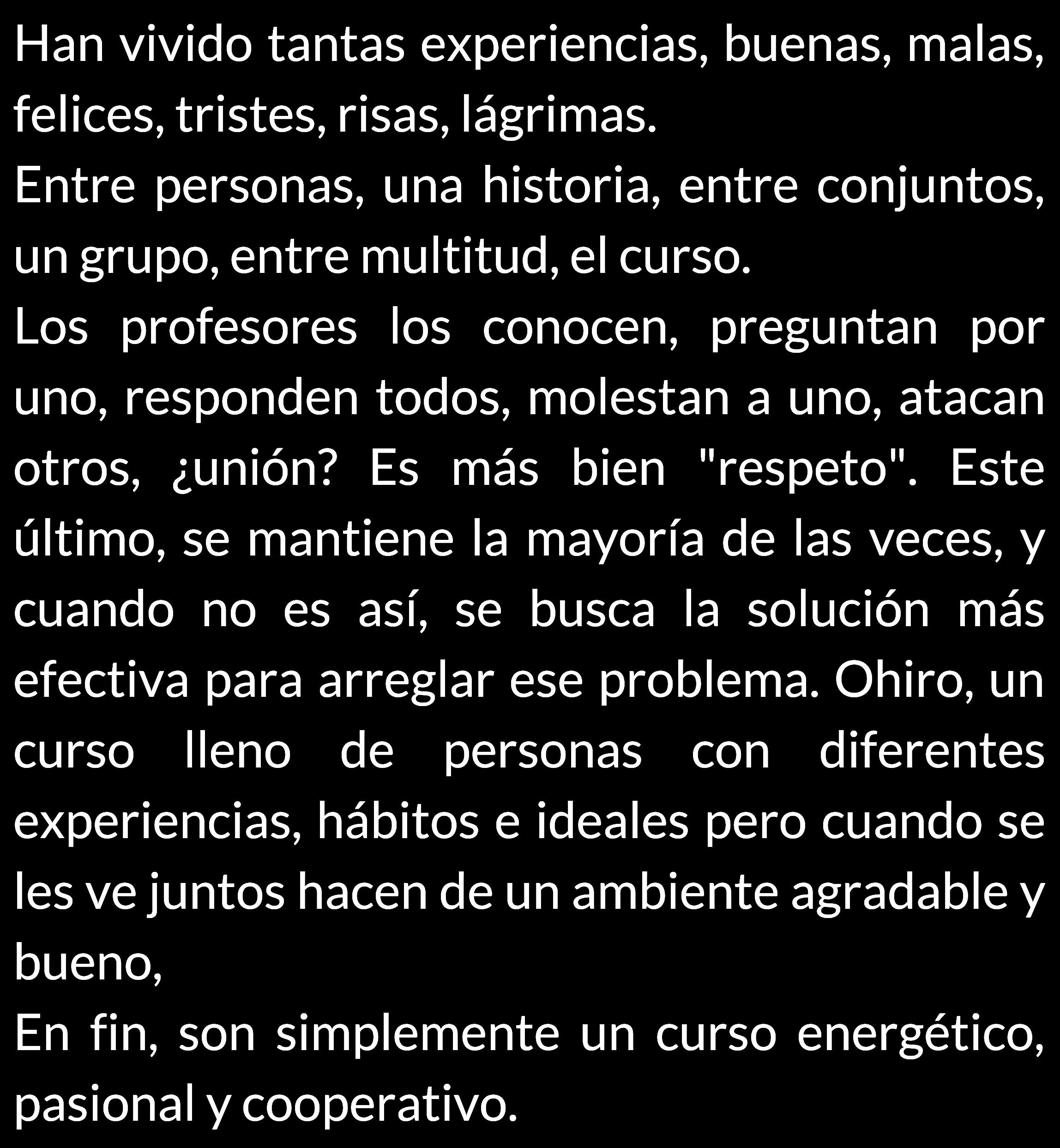 A veces en la clase me siento pequeña. Escucho como todos al rededor se conocen y trabajan en conjunto. No soy muy sociable que digamos. También veo como se saben las respuestas más difíciles, analizan profundamente una situación compleja y encuentran una solución. En ese momento me cuestiono si mi cerebro sirve, si en algún momento llegaré a ese nivel de complejidad. En educación física es peor, veo ta todos tan disciplinados, tam capaces, tan fuertes y coordinadas, y yo apenas me puedo mi propio peso. Siento inferioridad, miseria, quiero gritar, llorar y desaparecer. Pero luego siento que alguien toca mi hombro. Son esas personas consideradas amistades, las cuales, ante la mínima demostración de tristeza y desmotivacion vienen a la ayuda y tratan de todo para lograr animarme. También hay personas con las que se interactua muy poco qie intentan a animarme. Estoy conmovida. Y caigo en cuenta, nadie en esta institución es superior al otro. Somos seres humanos moralmente grises, con cualidades y defectos, preocupados de nuestros propios errores pero capaces de ayudar a quienes lo necesitan.