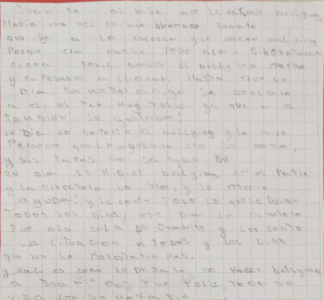 Hace no mucho había un niño llamado Carlitos que tenía discapacidad visual, este se empezó a incorporar a un Colegio y estaba muy ansioso porque no sabía cómo sería su trato hacia él, ya que, en su anterior colegio recibió muchas críticas y burlas. Pero todo cambió al momento de entrar a la sala, no había murmullos ni risas, sus compañeros fueron bastante empáticos e incluso el colegio hizo cambios para que Carlitos pudiera estar cómodo en el colegio y no se le dificulte su derecho a la educación.