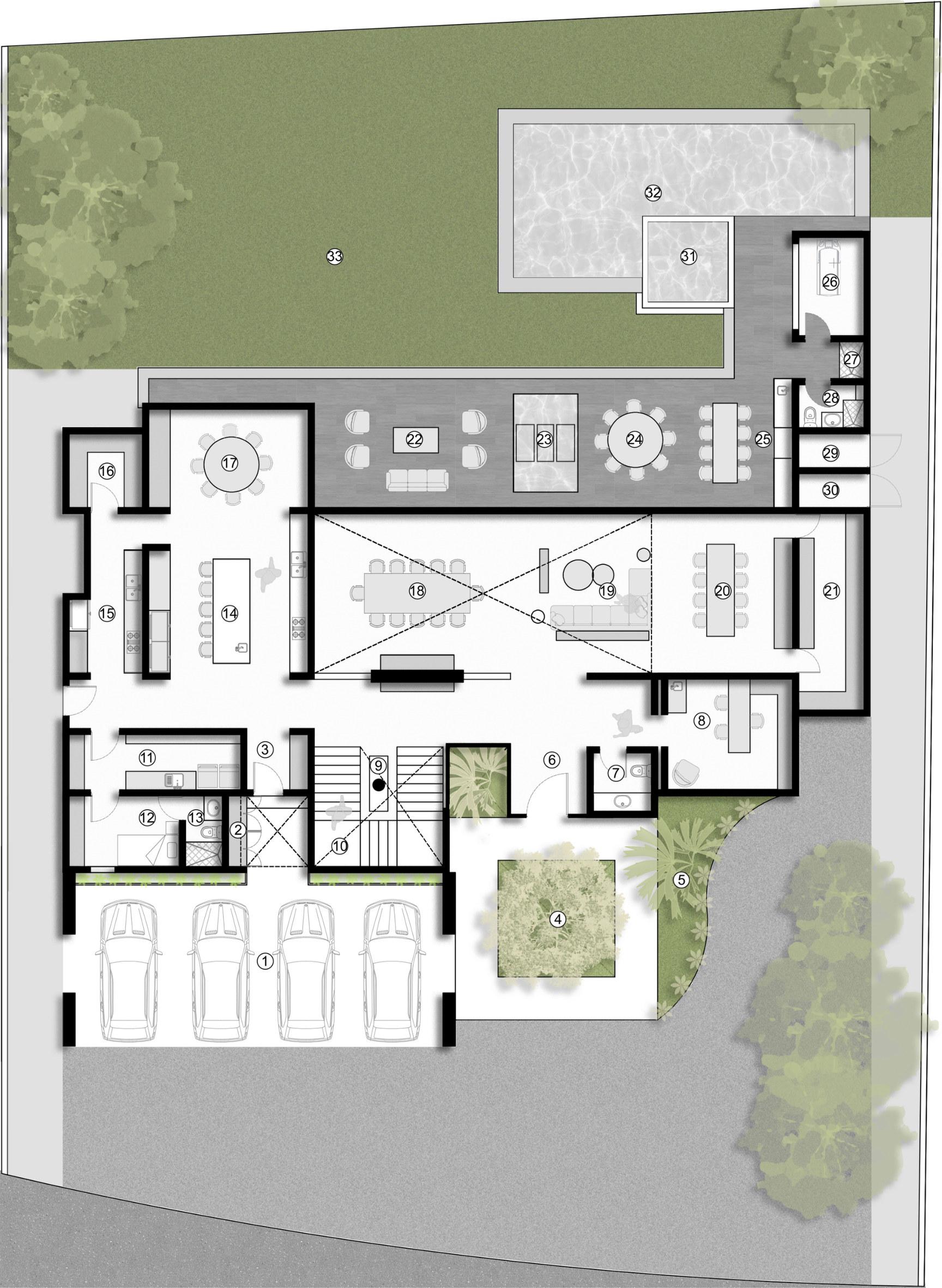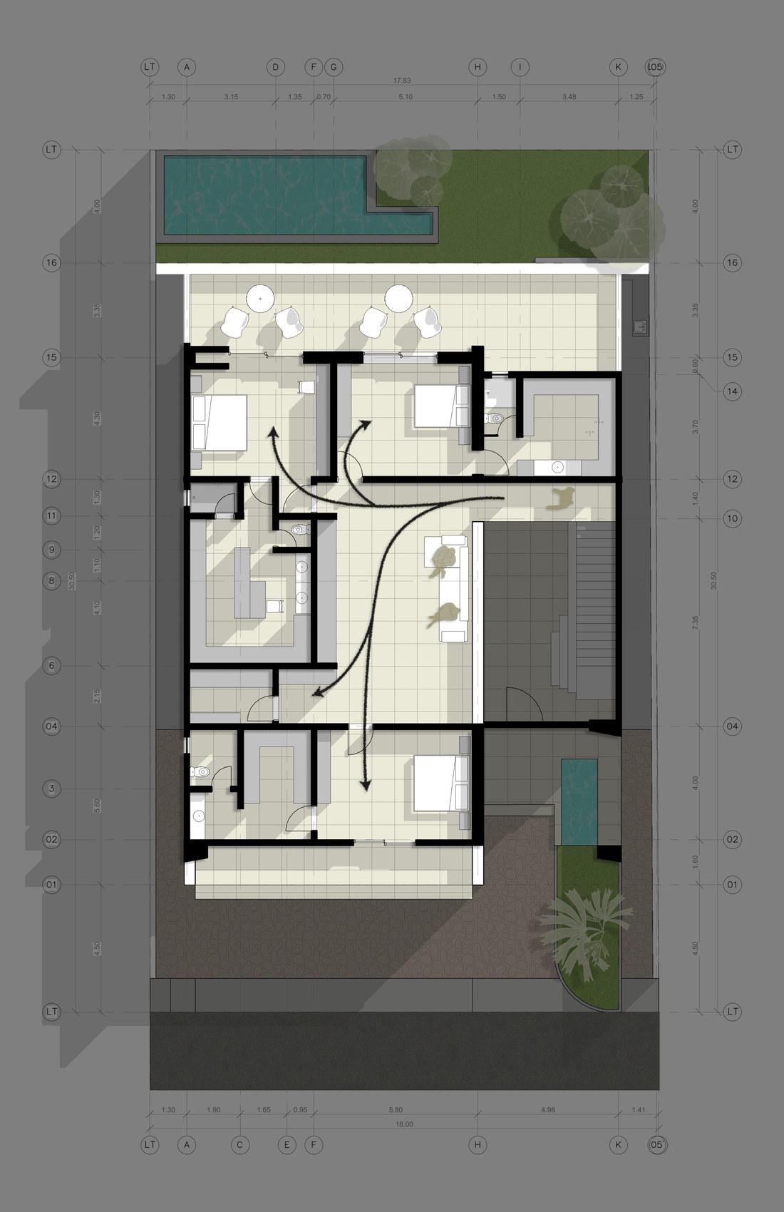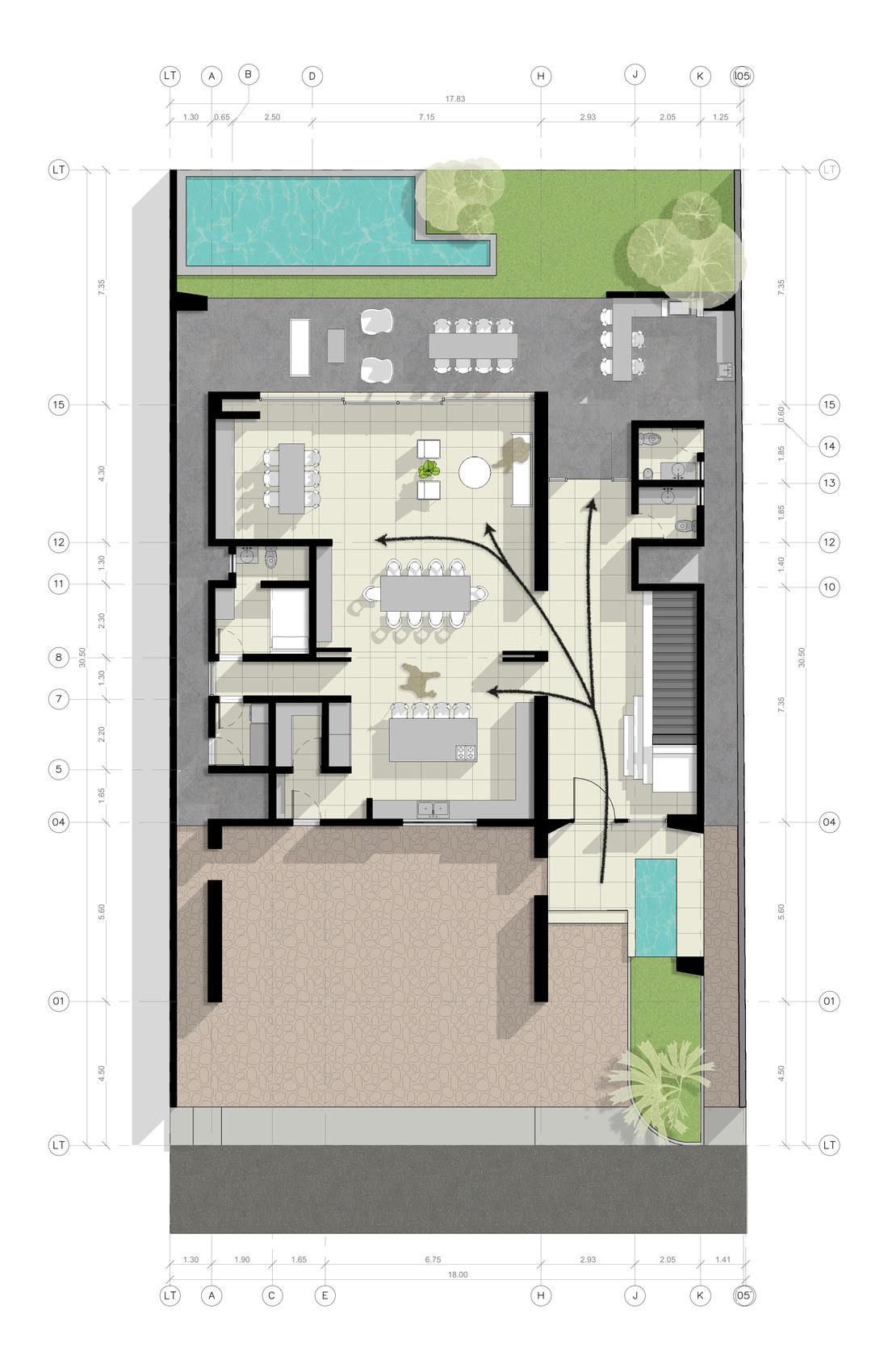 La distribución de la casa gira en torno a un jardín interior, el cual permite la captación de aire fresco, generando ventilación cruzada.