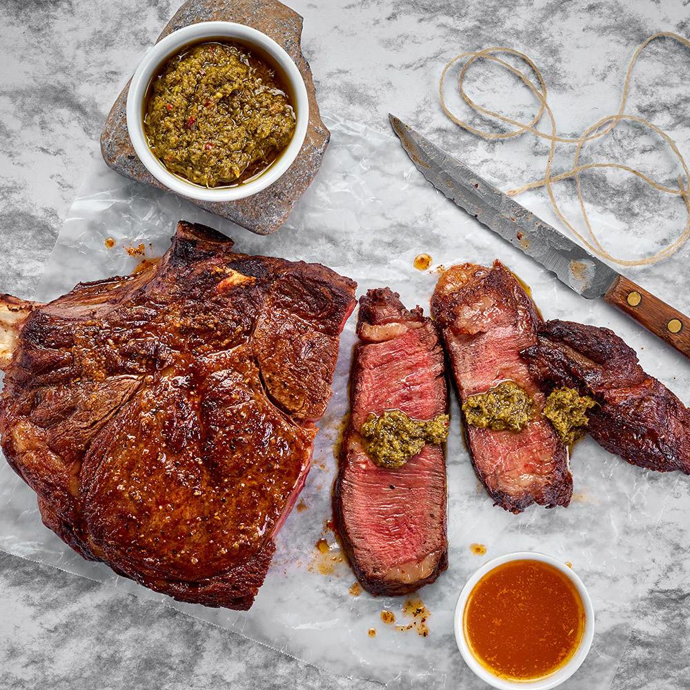 FILETE A LA PARRILLA CON SALSA DE PESTO DE ESPINACAS RIB EYE STEAK CON VINAGRETE DE NUEZ