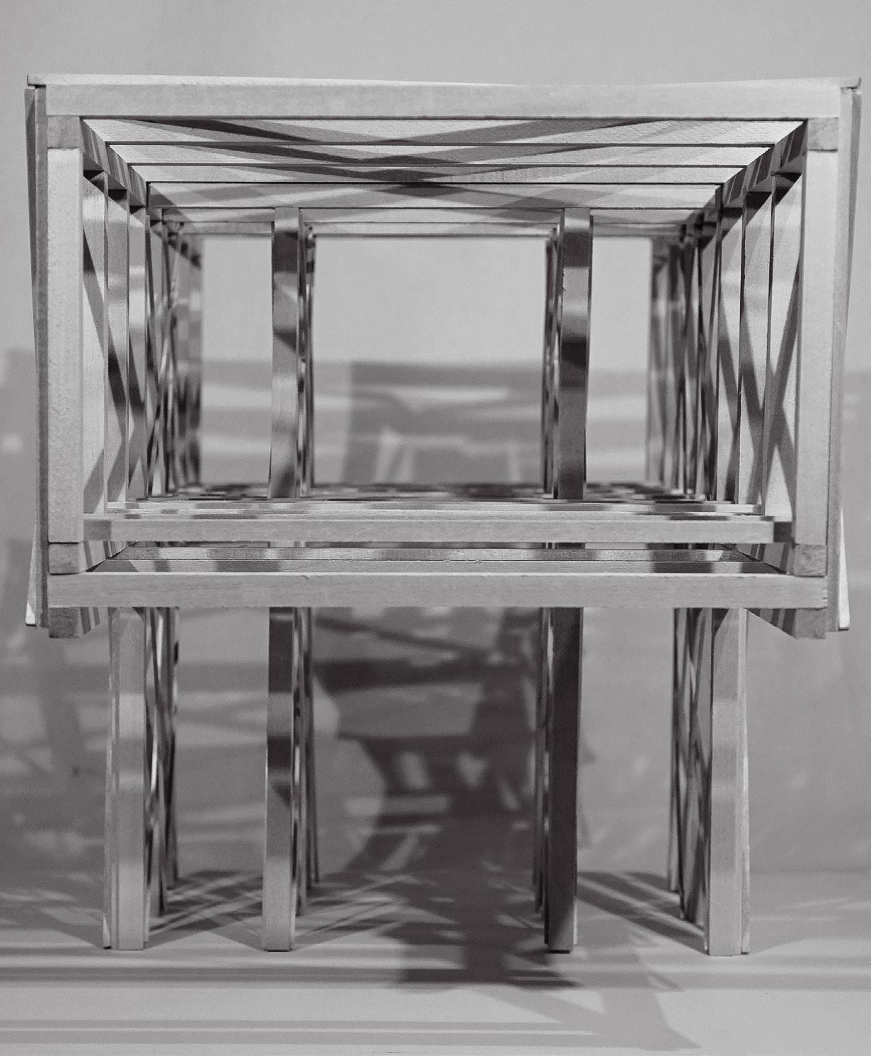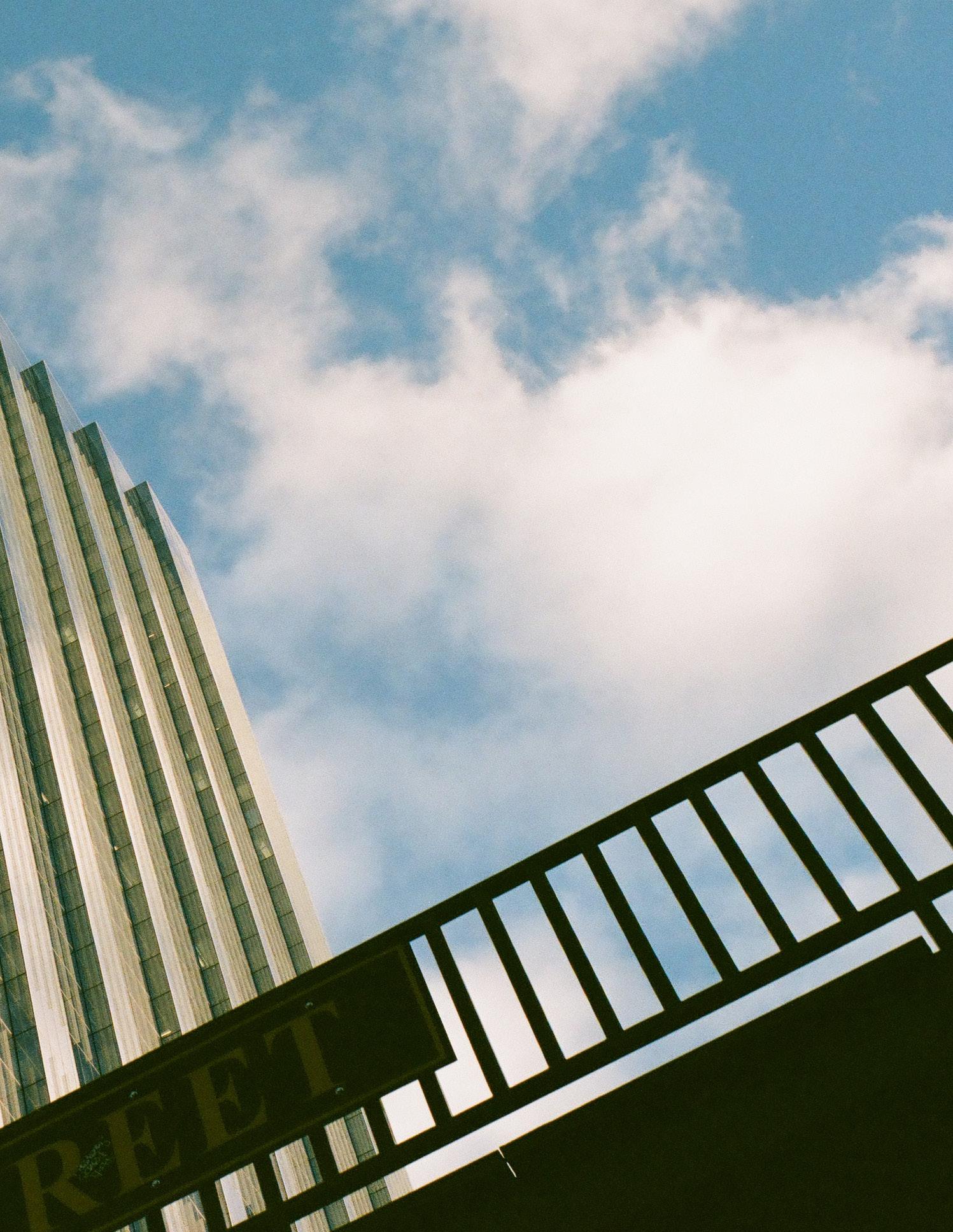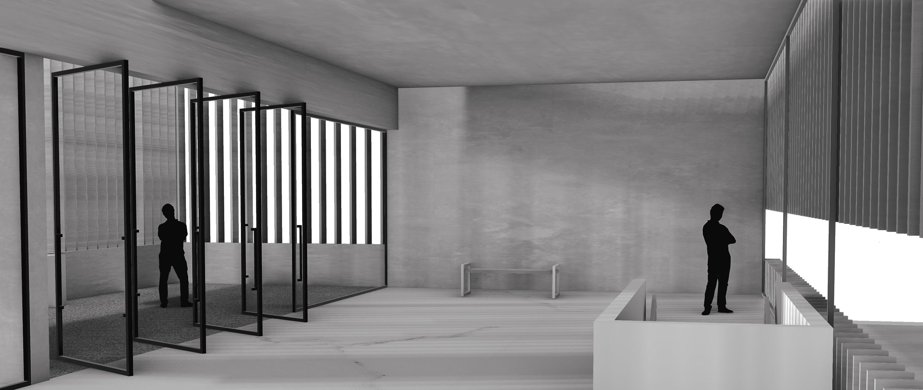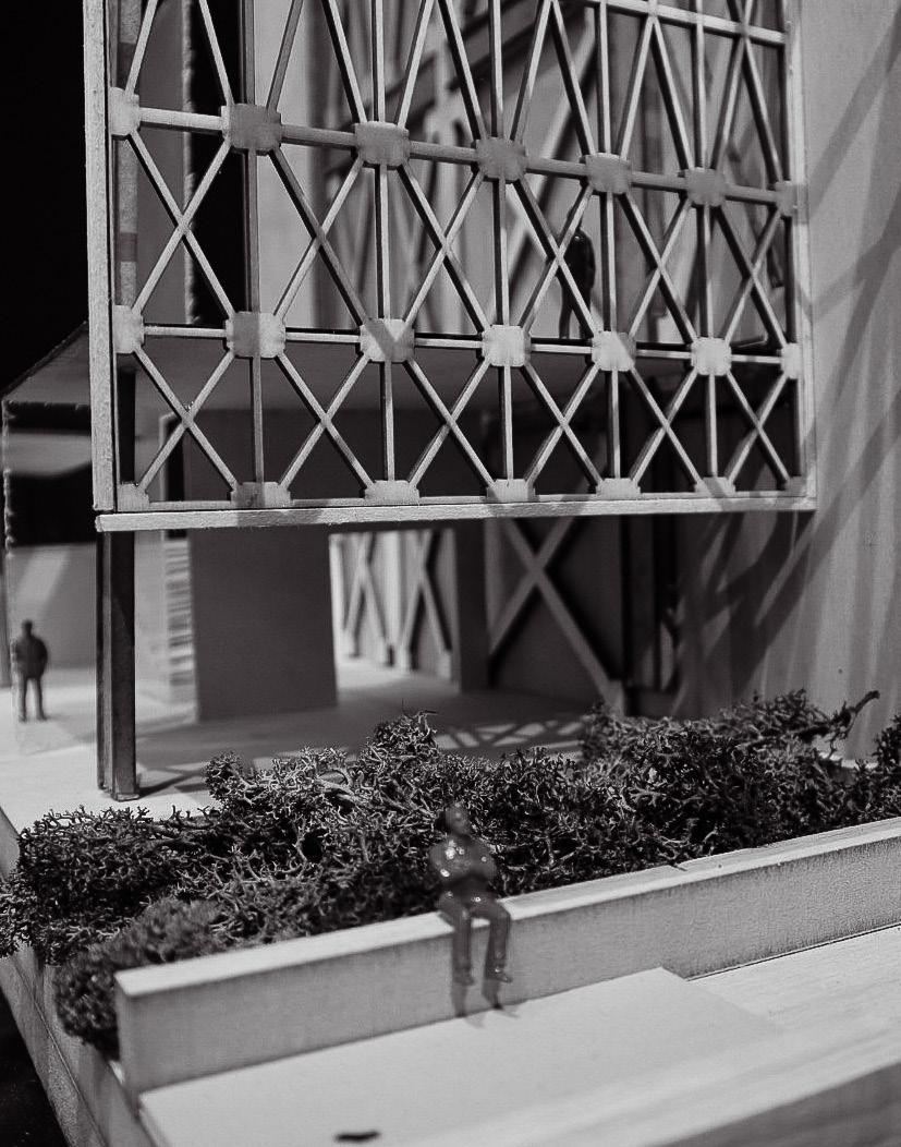 THE SYSTEM_A grand steel gesture of the façade establishes a new volume to the aesthetic of the street and sidewalk. Influencing users’ perception of space and scale, both externally and internally, the cantilevered façade brings a distinctive identity to the structure that alters the perceived size and massing of the building from the exterior similar to a gantry crane. In this instance, the bracing motif of the conceptual model is simply expressed as an element hung from the structure of the main massing. The cross bracing offers a tactile connection to the structure of the façade that users can become immersed in. Other exterior opportunities are offered in the user experience through an outdoor terrace suspended above the street edge offering panoramic views or outdoor gathering areas. The suspended condition also presents the opportunity to internally define spatial hierarchies and transitions between programs, continuing to contribute to the sense of openness or enclosure. Influencing spatial organization, the cantilevered façade defines a clear entry space that has protection from harsh elements and required ventilation. At the street level, a stramp plaza and grand stair corridor expression becomes a public space that is inviting and supported by the aesthetic and formal language of the structure. With a vision to influence the interaction of the urban context, this sequence focuses on the experience of the exterior to invite users to the interior.