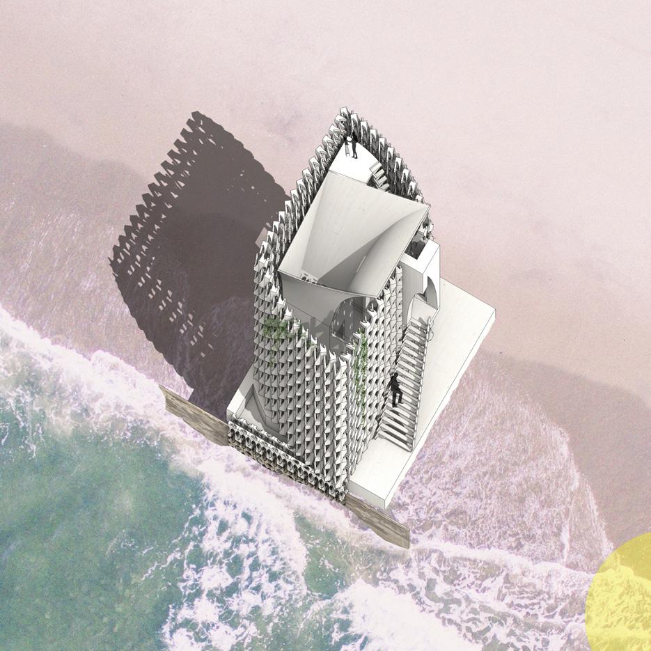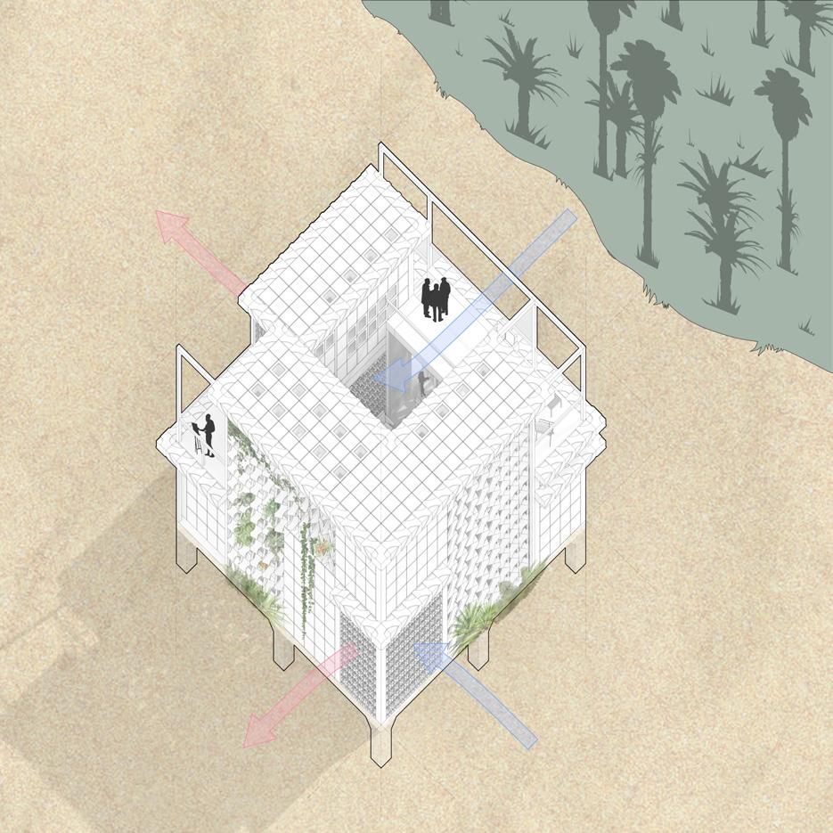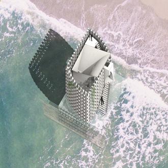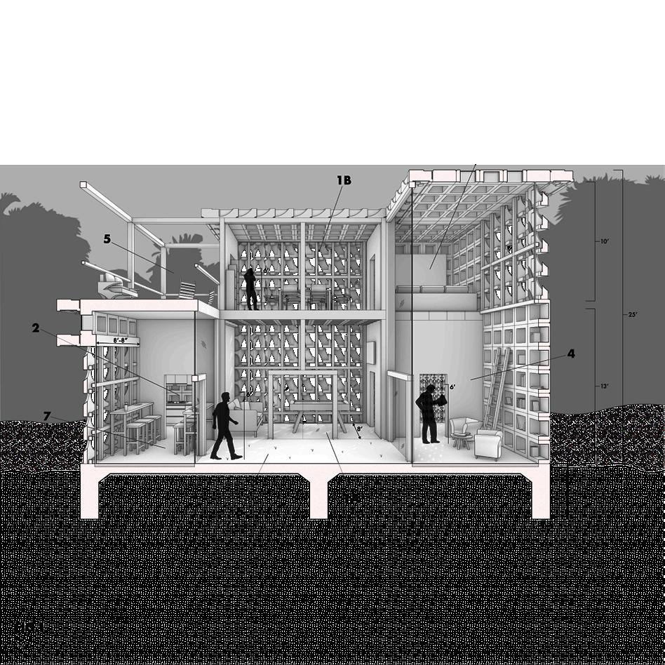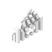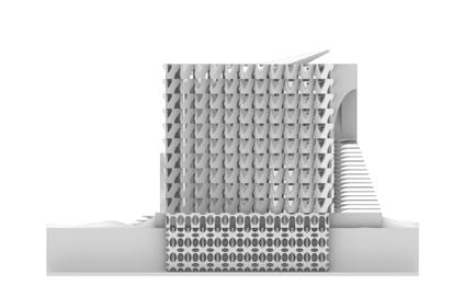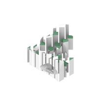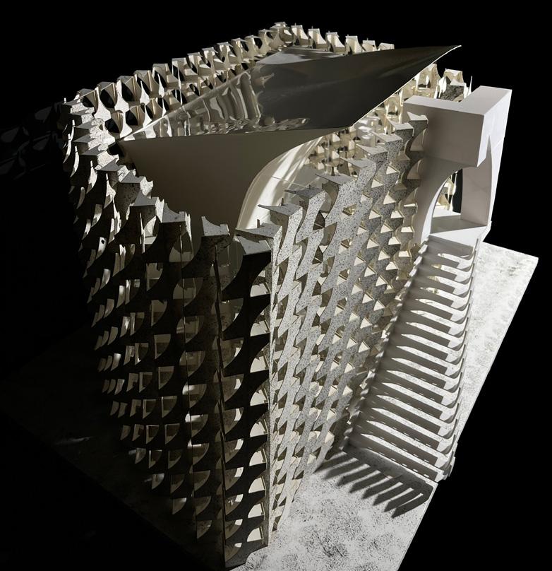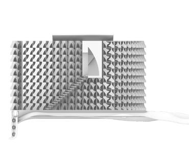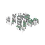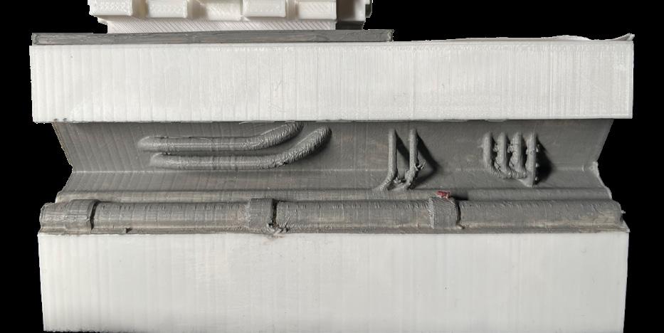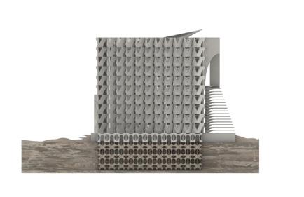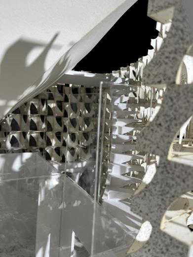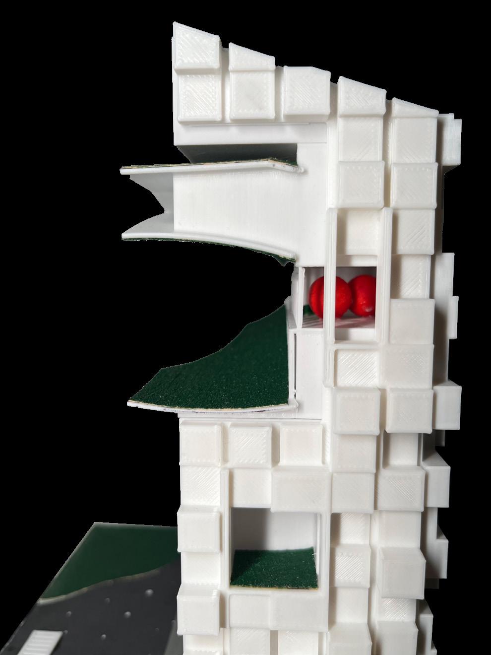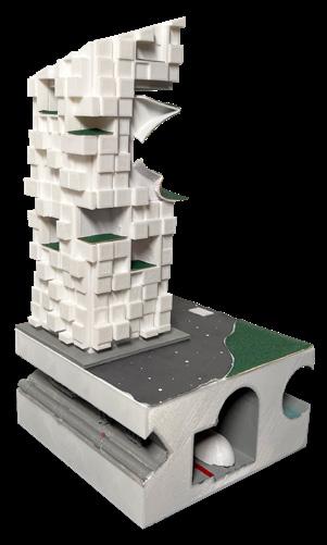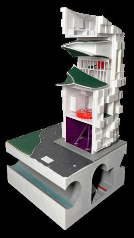 THE BASE OF THE MODEL EXPOSES INFRASTRUCTURE BURIED BENEATH THE CITY. THE INFRASTRUCTURE SHOWN FEATURES THE SUBWAY SYSTEM, A SEWAGE AND DRAINAGE SYSTEM, AND PIPING USED FOR UTILITIES INSIDE OF BUILDINGS AND THE COOLING NETWORK TO HELP REDUCE THE HEAT ISLAND EFFECT. FINALLY, THE FACADE IS ONE BASED ON THE INHERENT MODULARITY OF THE GROUP’S WORK; IT CAN BE EASILY MASS-PRODUCED AND PROVIDES DYNAMIC STIMULI FOR THE VIEWER.