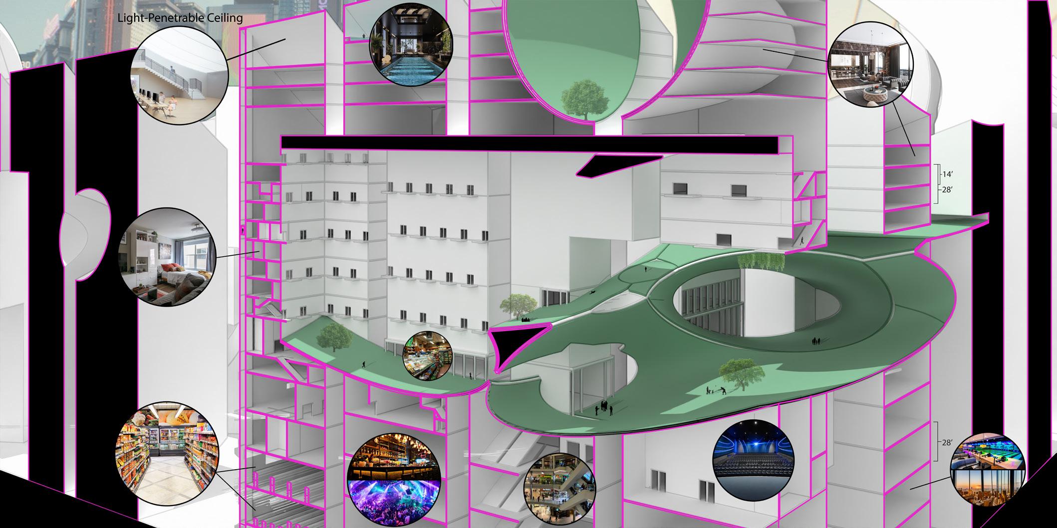 THE THIRD FLOOR FEATURES THE PEDESTRIAN-FRIENDLY OUTDOOR WALKABLE GREENSPACE AND THE OPEN MARKETS AND BODEGAS FOUND IN THE COMMUNAL AREA. FINALLY, THE TOP FLOOR DISPLAYS THE RESIDENTIAL, COMPLETING THE MIXEDUSE GAMUT.