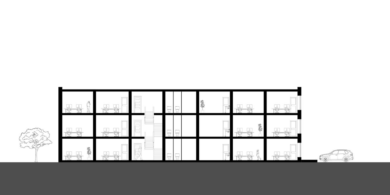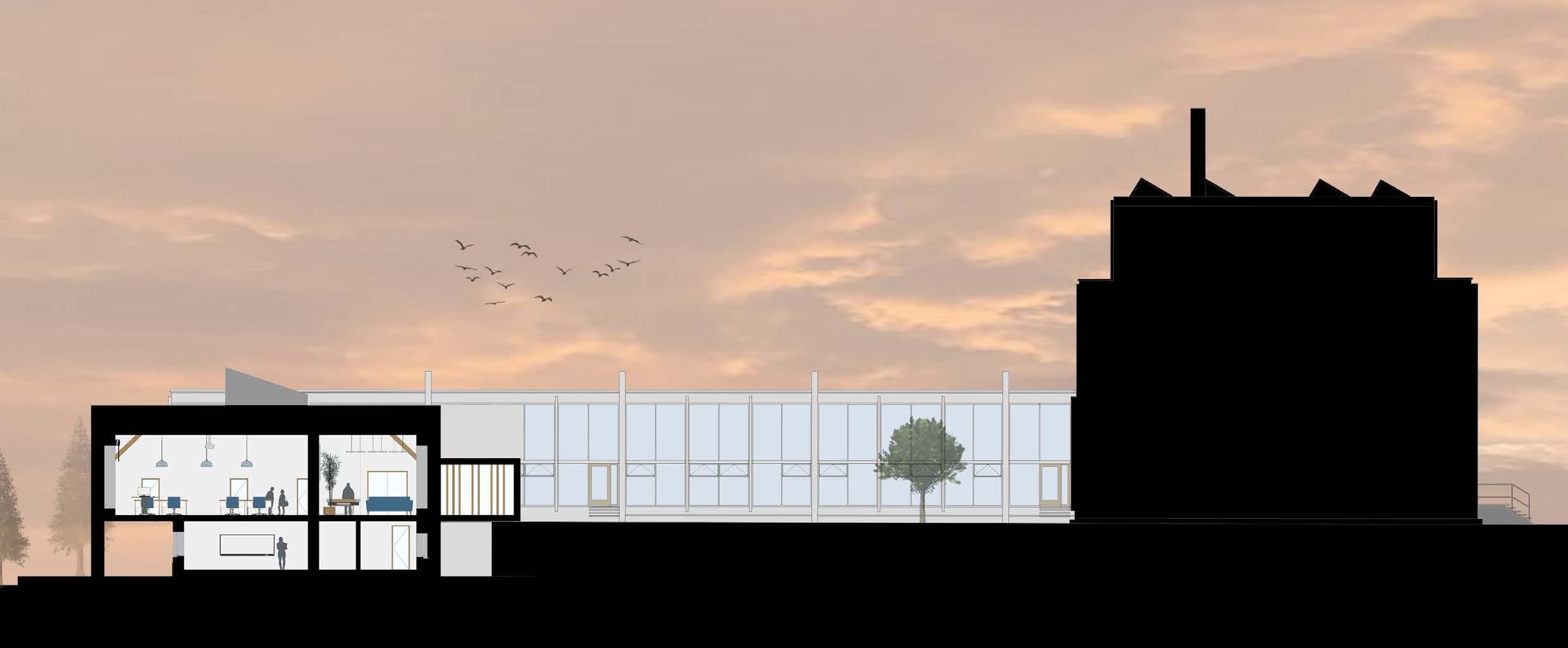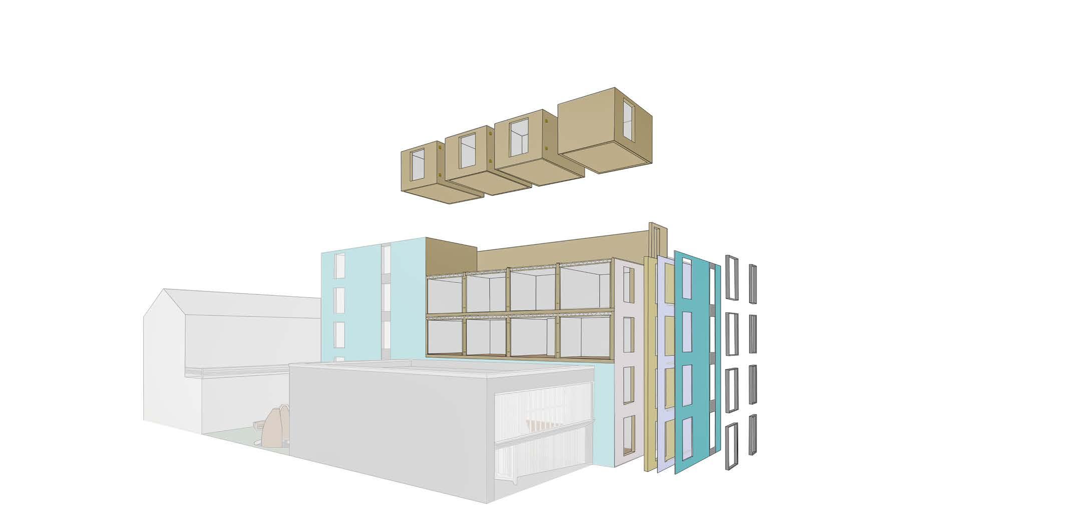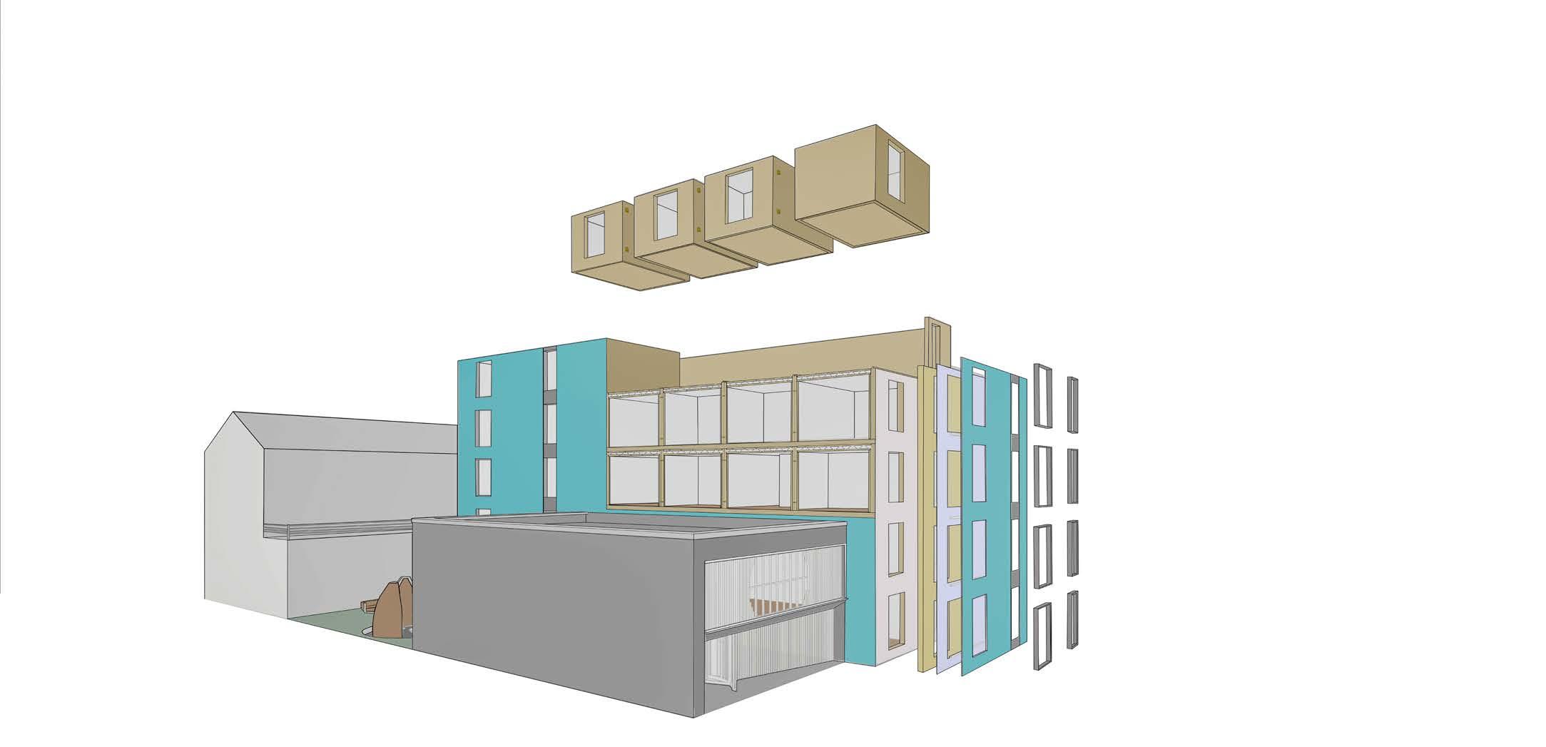 The modular pods will serve two main purposes. Firstly, they will be used as office spaces which can accommodate up to six desks and a small kitchen. Additionally, these pods can be re purposed for commercial use or as additional office spaces. This will enable the reuse of a majority of the materials used in the construction, including the modular pod structure, insulation, and cladding. As a result, there will be minimal material wastage and a significant reduction in the carbon footprint of the new structures. Secondly, the pods will also be used as commercial toilets for the entire building.