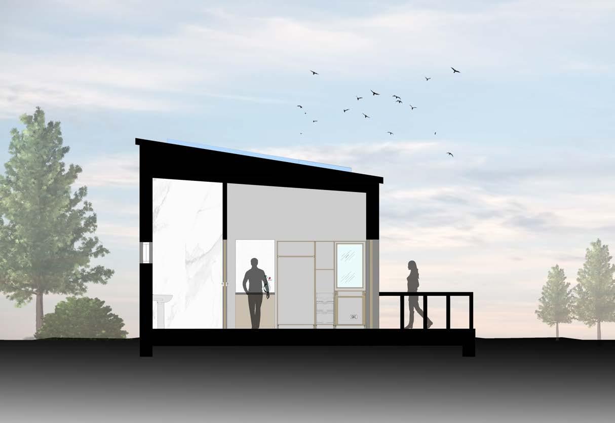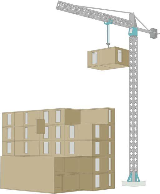 This design implements circular economy principles to reduce the carbon footprint and material waste during construction. To achieve this, CLT modular construction is used, which involves prefabrication. The pods are manufactured off-site and then transported to the desired location using lorries and cranes for placement. The pods use friction connections, inspired by Japanese construction, which allows for minimal steel connections, thus reducing material waste and the carbon footprint of the structure.