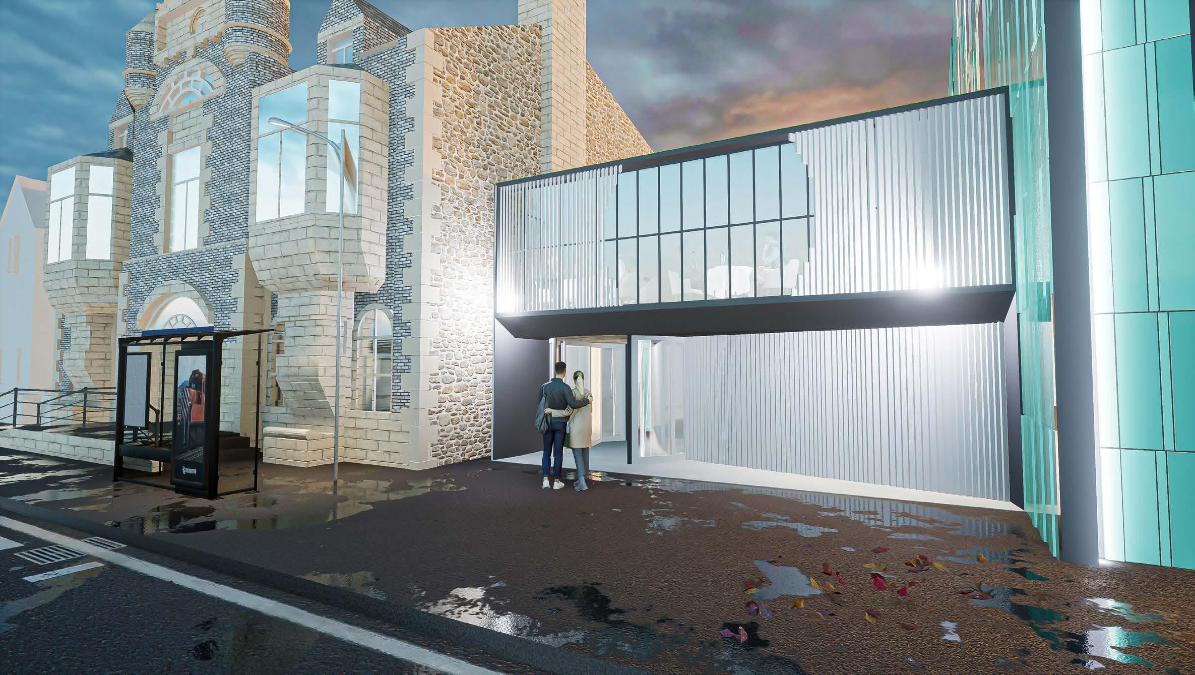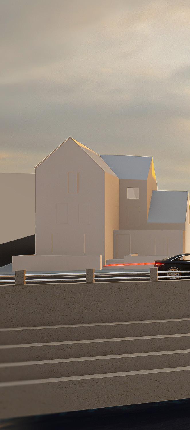 I have opted for a conventional L-shaped roof to maintain an effective yet simple design that blends in seamlessly with the surrounding architecture. After thorough material research, I concluded that a slate roof, complemented by a brick wall and render, would be the most aesthetically pleasing choice for the building. In addition, I delved into the heating strategy, as traditional boilers are not allowed. My investigation led me to consider PV solar panels and a ground source heat pump as an environmentally friendly heating solution.