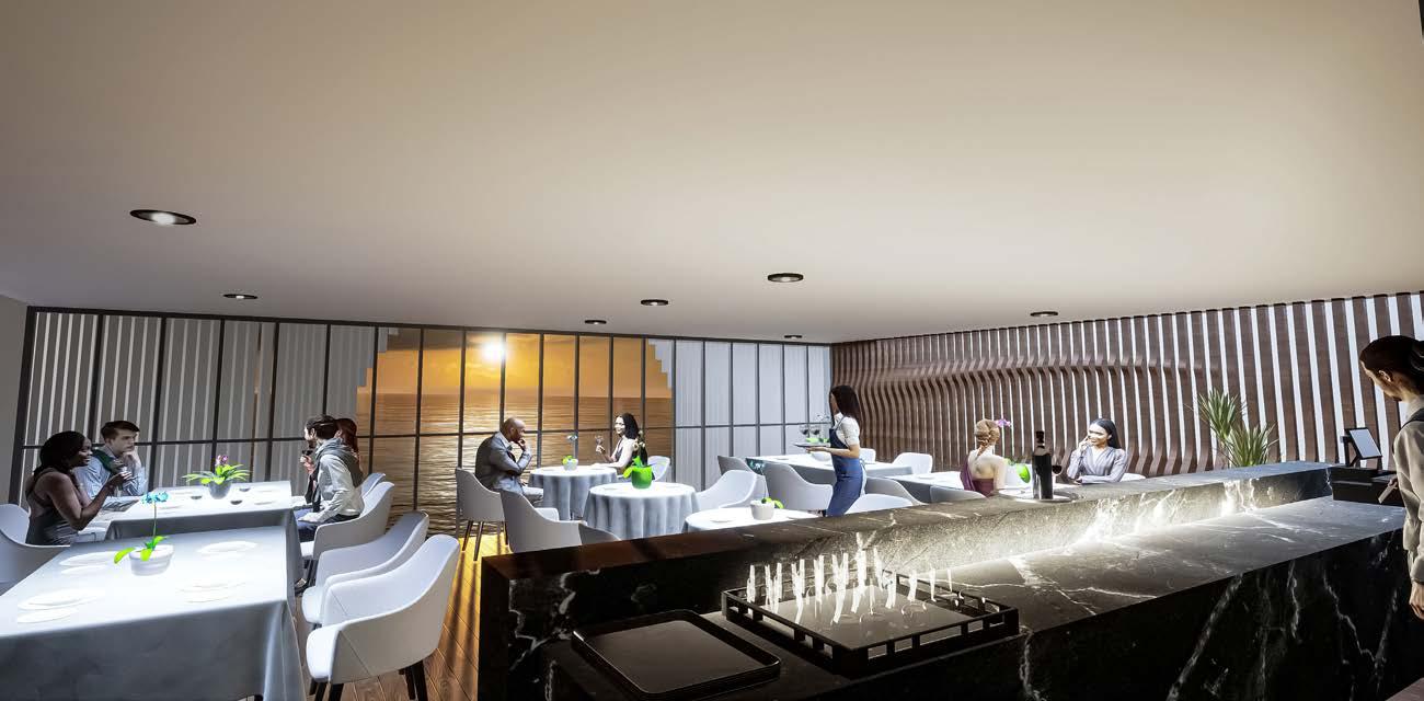 This area is designated for the restaurant. Curtain walling is used with a steel frame supports the frosted glass double-skin facade.