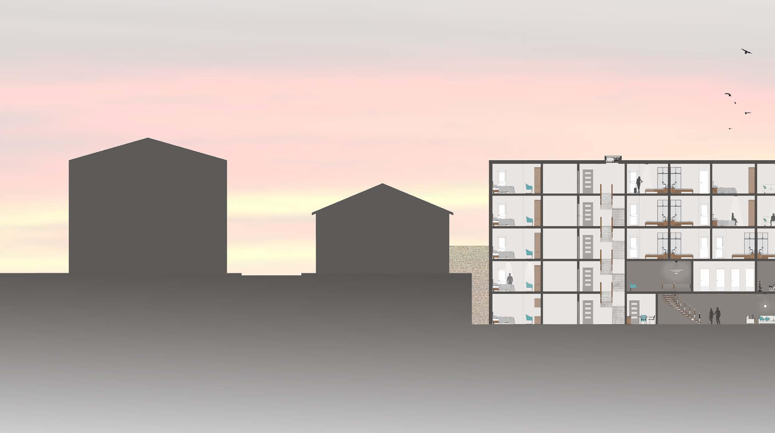 The client has requested that their site should feature a boutique hotel which was previously located there, which stood next to the town hall. They have also emphasized the need for the hotel to have at least 13 luxurious rooms and two suites that have their own living space. Additionally, a restaurant and gym should be provided for both guests and potential local residents.