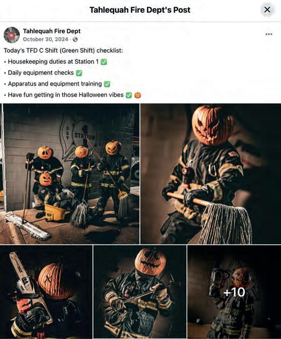 The Tahlequah Fire Department’s Facebook page serves as a vital communication hub for sharing essential fire safety information and department updates, and for showcasing the daily service Tahlequah’s firefighters provide the community. TFD strives to provide fun and engaging posts, fire prevention and safety awareness, and an on-thescene glimpse of the department’s work, in order to keep Tahlequah citizens informed and foster appreciation for the department’s continuous efforts to protect and serve the city.