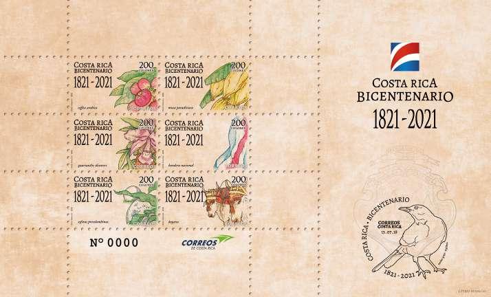 Serie: Costa Rica Bicentenario. Sello, Matasello, Sobre, Hoja Souvenir.