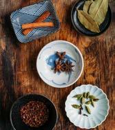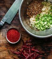 While the aromatics are cooking, gather and prep the edible ingredients. Finely chop the scallions, peel and finely chop the ginger, thinly slice the garlic, and cut the arbol chiles into 1/4” pieces. If you find that there is not enough time to prep these while the aromatics are cooking, remove the pot of oil from heat and reheat it once your ingredient prep is all done.
